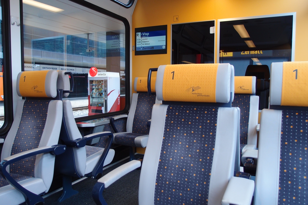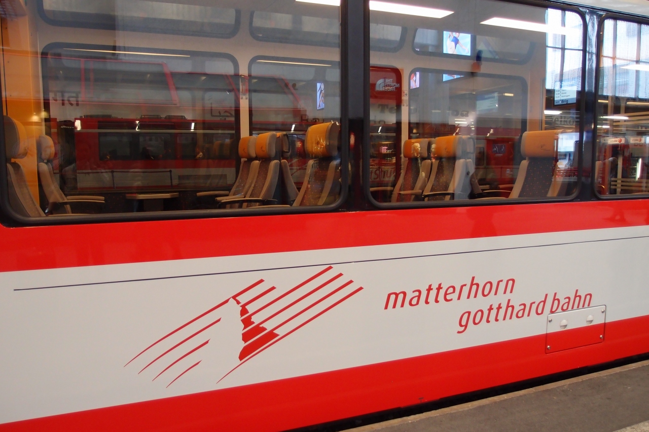 ベルン方面からツェルマットに向かう際には、フィスプでマッターホルン・ゴッタルト・バーンに乗り換えます。深い谷の間をマッターフィスパ川沿いに走る登山鉄道で、1等車と2等車がありました。車窓を眺めていると約1時間10分でツェルマットに到着しました。