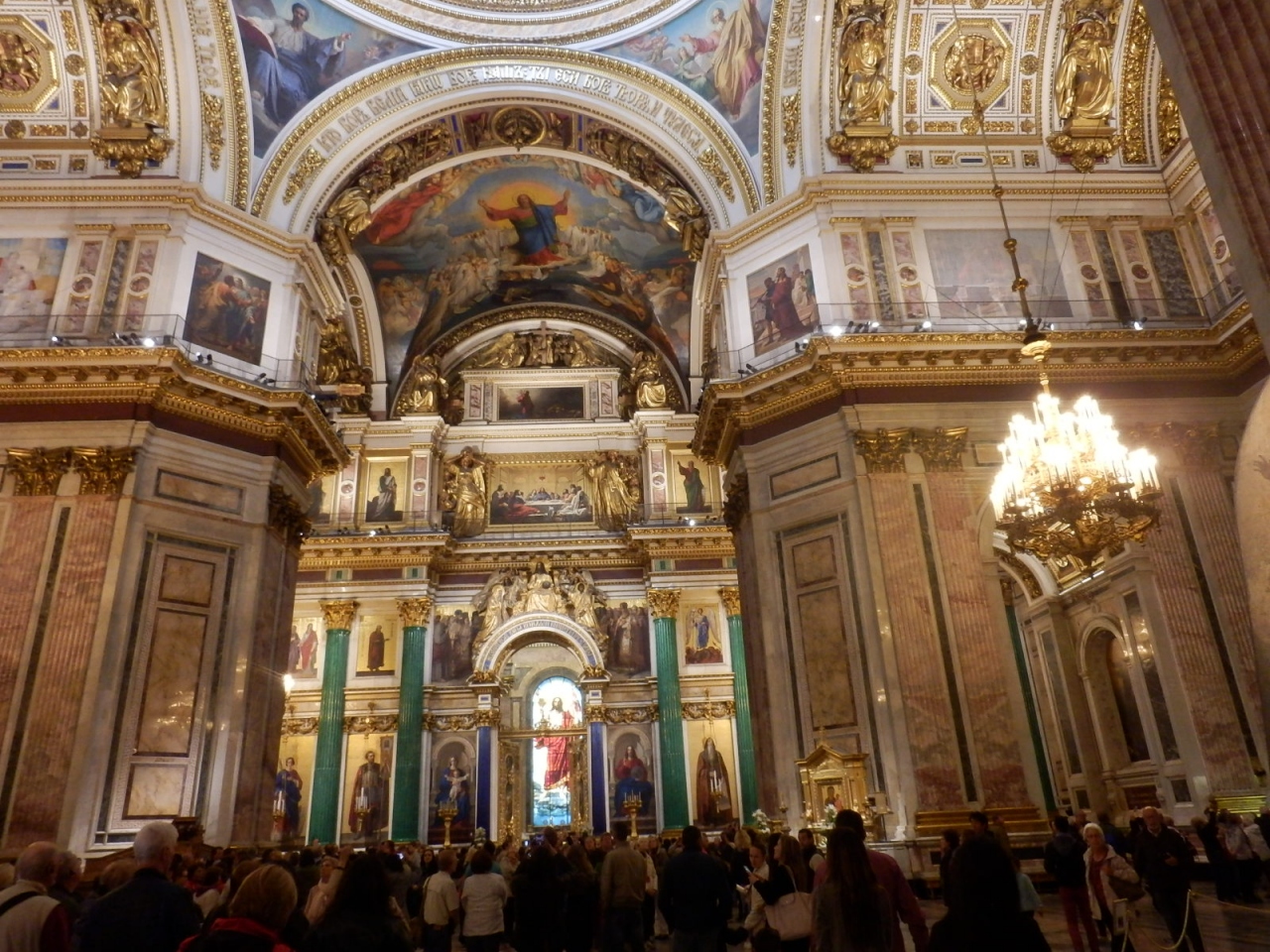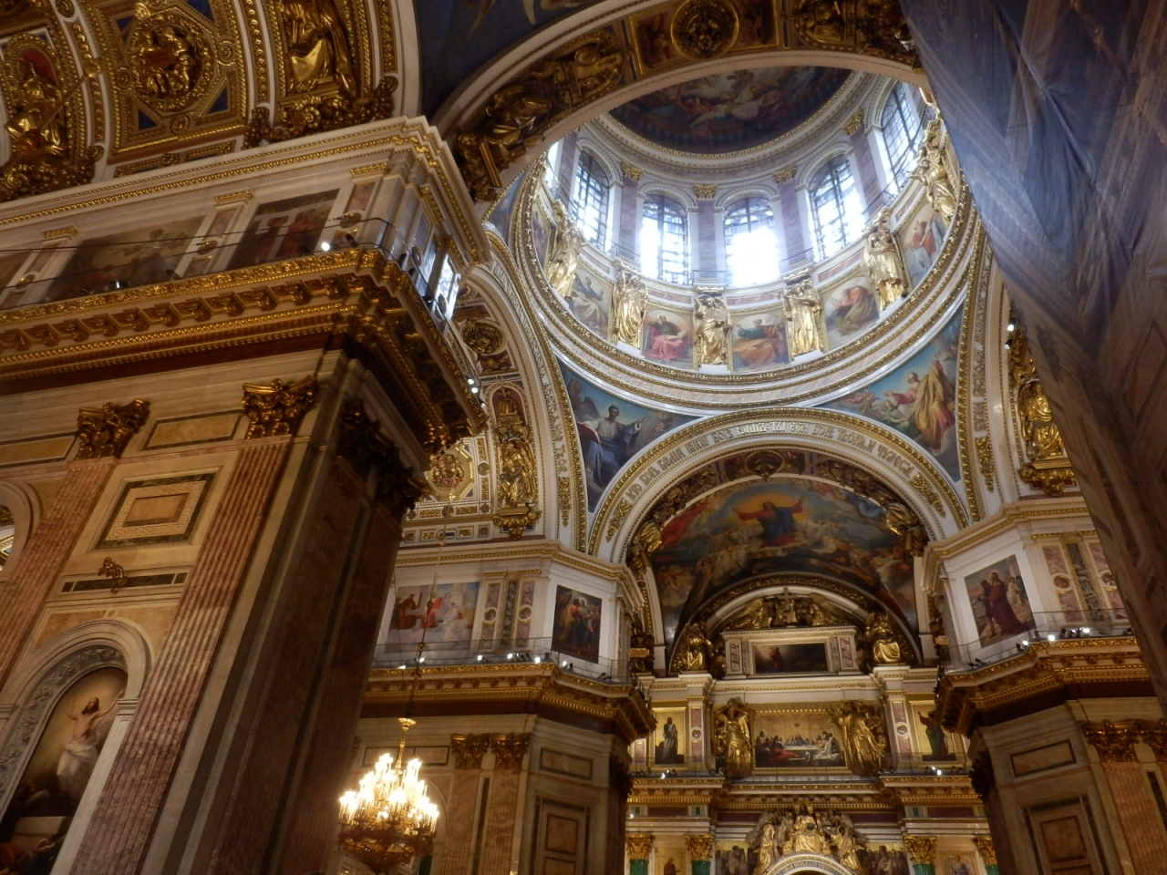 サンクトペテルブルグでは見逃せない観光スポットです。外観はどっしりとしていて質実剛健のような印象でしたが、中に入るとまた違った印象で、天井画の美しさに見とれてしまいました。