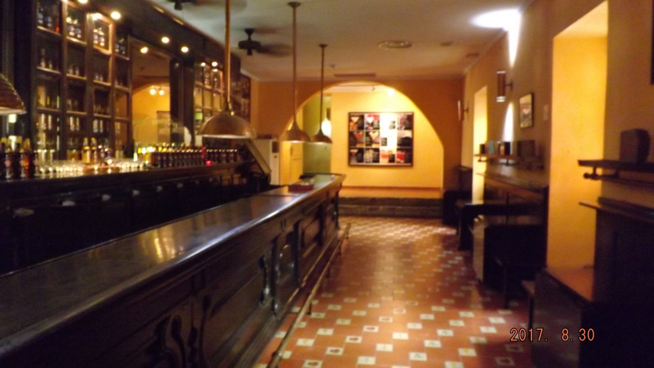 製造工程の最後に熟成中の樽が置いてある部屋があります。そこを出て階段を下りてくると、黒くて長いカウンターのある、試飲室というよりちゃんとしたカウンターバーがありました。試飲が済むと、隣は土産物ショップとなっており、「ハバナクラブ」が棚いっぱいに並んでいました。
