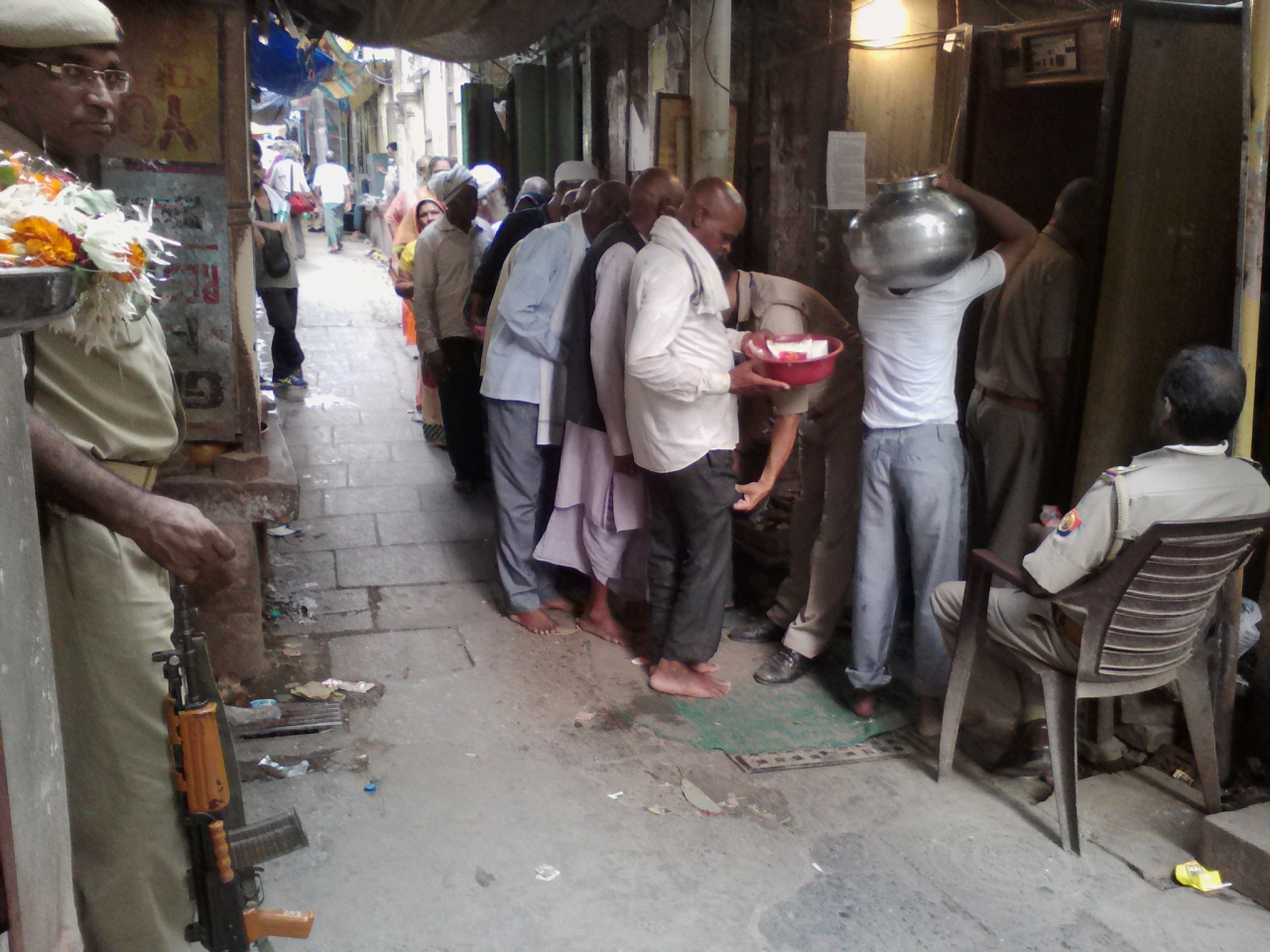 ゲート前には銃を持った兵士?がいてボディチェックされます。これで路地に入れます。路地は狭くて供物や土産物を売る店が並んでいます。そして寺院の入口前にあるセキュリティの詰所でパスポートを見せレジスト(外国人のみ)。最後に寺院の入口でボディチェックを受けやっと中に入れます。内部にも銃を持った兵士がおり物々しいです。そんな中で人々は熱心過ぎるほどに参拝しています。内部はとても厳かな雰囲気でしたが異教徒である私には縁遠い世界。一回りして外に出ました。寺院を訪れる際にはパスポートをお忘れなく…。