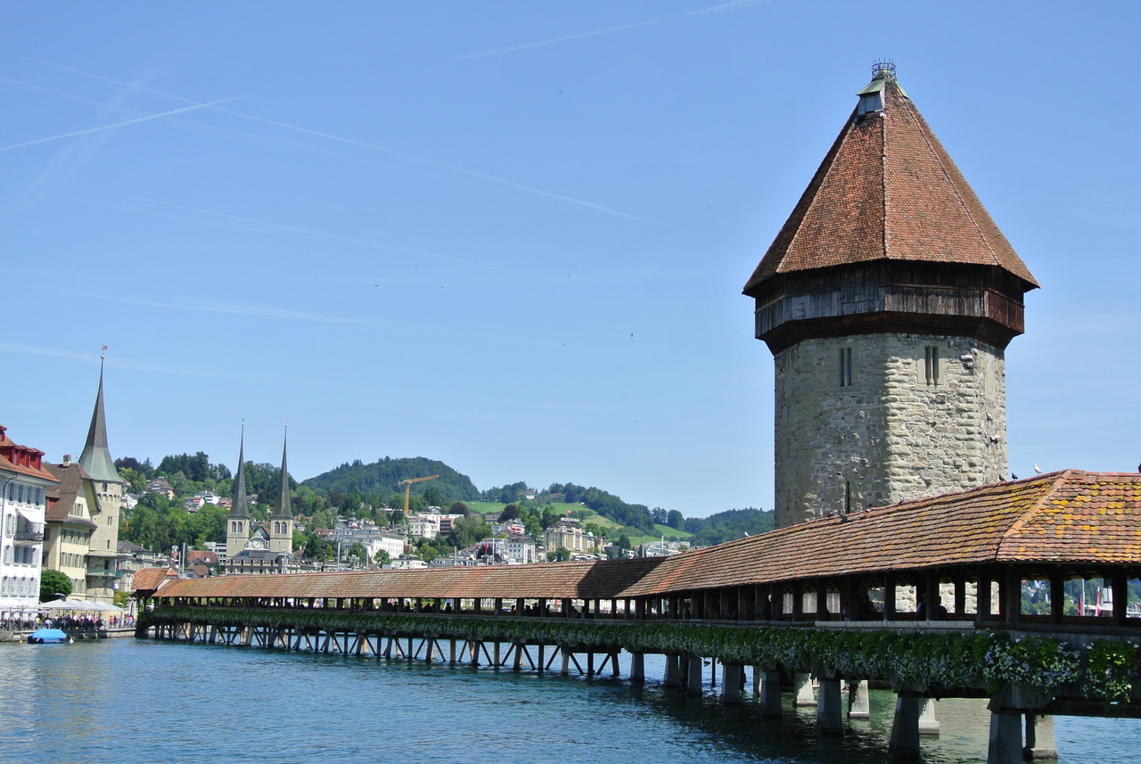 ルツェルンといえばロイス川にかかるこのカペル橋。梁に花が飾られ美しい姿です。橋を歩くより遠くから眺めていたい橋です。橋の真ん中あたりにある塔は土産物屋になっていて、団体観光客で賑わっていました。かなり割高でしたので、旧市街にある土産物屋で買う方がいいでしょう。