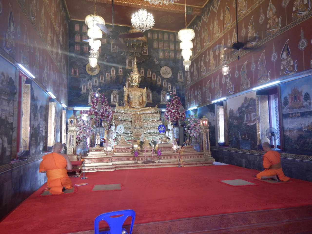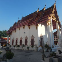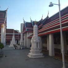 ヤワラート通りをチャオプラヤ川の方に入っていったところにある寺院。「えっ。こんなところに大きな寺院があるんだ」と思わされる寺院だ。3層の屋根、高くそびえる白い壁、本堂の周囲には回廊がある。ガイドブックの地図には寺院の名前は載っていたが、観光客はほどんどいないので静かでよかった。