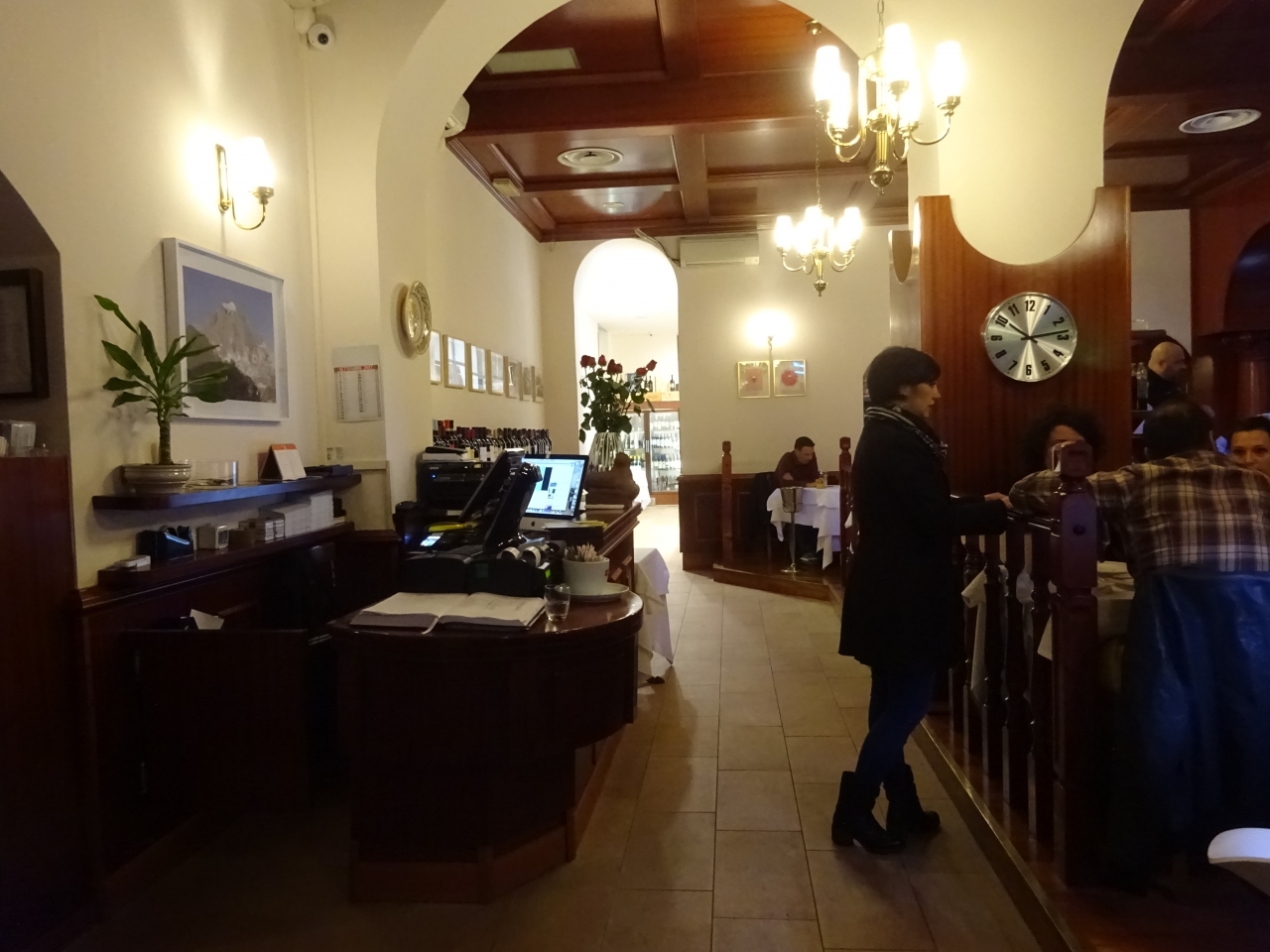 入ってすぐに新鮮な魚や貝の冷蔵ケースがあります。生ガキや生の海老などシーフードが有名のようです。ピザ釜もあって、テイクアウト用のピザが何枚も焼かれていました。タコとジャガイモのサラダ、スズキのカルパッチョ、ポルチーニのパスタ、鱈のパスタ、ワインをグラスで飲んでデザートとコーヒーで120ユーロほどでした。