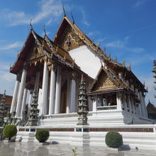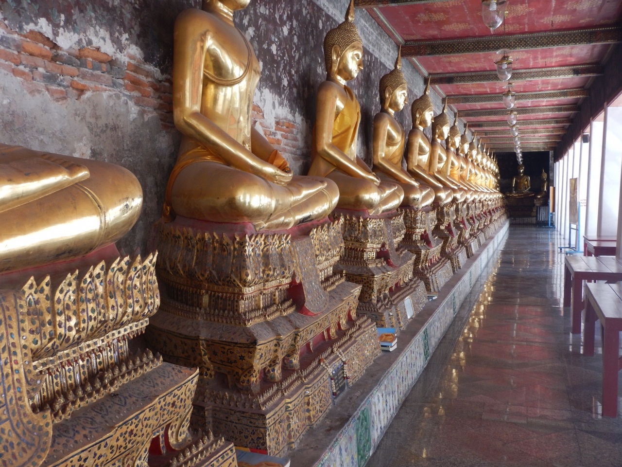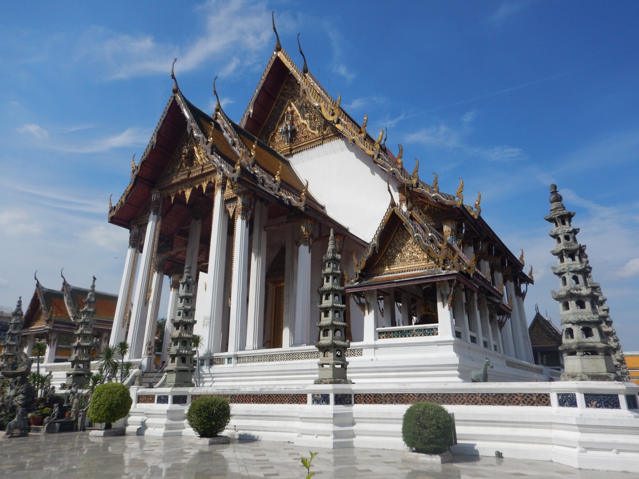 ラーマ1世によって建立された寺院だけあって本堂の建物は巨大だ。白い柱が何本も立っており、屋根の飾りも見事だ。手前に立っている小さな仏塔のようなものが特徴的だ。回廊には仏像がずっらっと並んでいる。いったい何体並んでいるのか、数えてみることはしなかったが、相当な数だ。