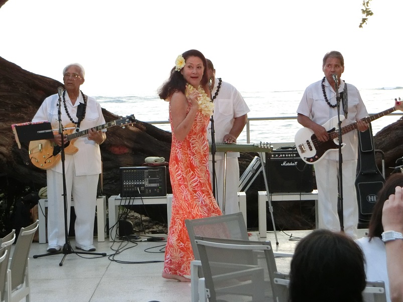 5:30PM頃からハワイアン・ミュージック演奏が始まり、6:00PM過ぎから「カノエ・ミラー」さんのフラダンス・ショーが始まりました。