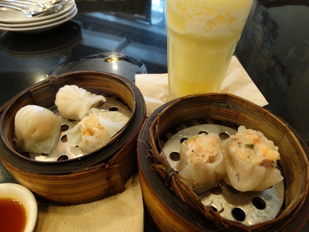 店内の壁画や照明などがとてもオシャレで居心地がよく、パイナップルアイランド・ジュースのやさしい甘さが、疲れた体に滲みわたって美味しかったです^^/飲茶の海老シュウマイだったか、肉のにおいがきつくてT_Tおまけにパクチーが入ってて"ナンデヤネン!"って一人突っ込みしました^^;;