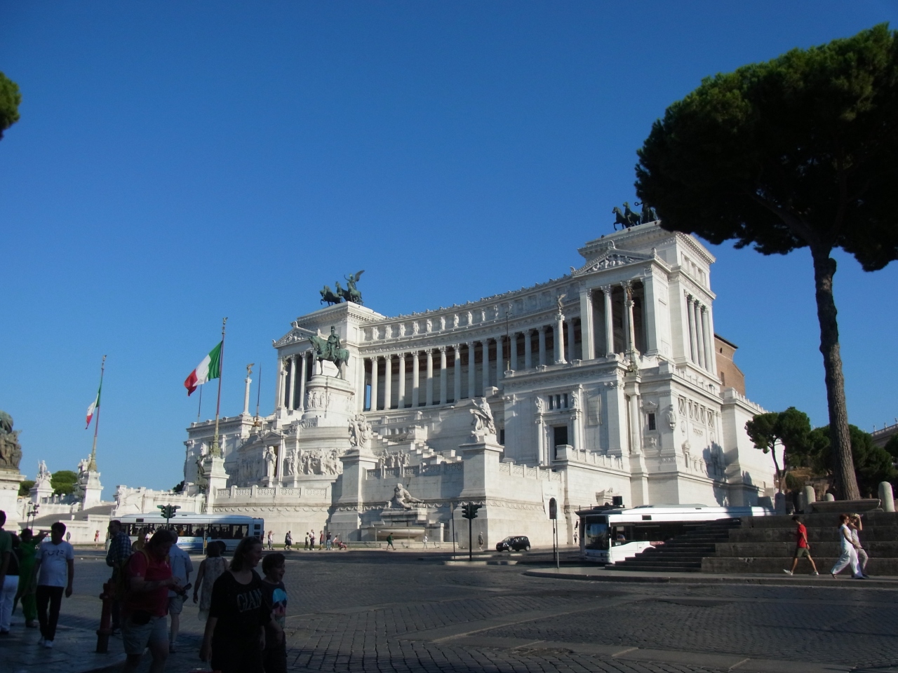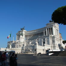 ヴィットリオ・エマヌエーレ2世記念堂は、アルターレ・デッラ・パトリアとも呼ばれる建物で、ヴェネチア広場にあります。真っ白な外観に、彫刻の像があり、左右に掲げられたイタリアの旗が映えていました。