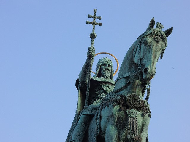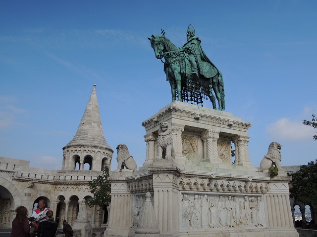 ハンガリー建国の父、聖イシュトヴァーンの騎馬像は漁夫の砦の南端にあり、台座には戴冠式の様子が彫刻されています。聖イシュトヴァーンは初代ハンガリー国王で手にする二重の十字架はこの国を象徴する聖なる印です。日中にこの裏手にある階段から漁夫の砦に上がるには料金徴収の係員がいますが、夕方係員が帰った後なら2階回廊にただで登れます。