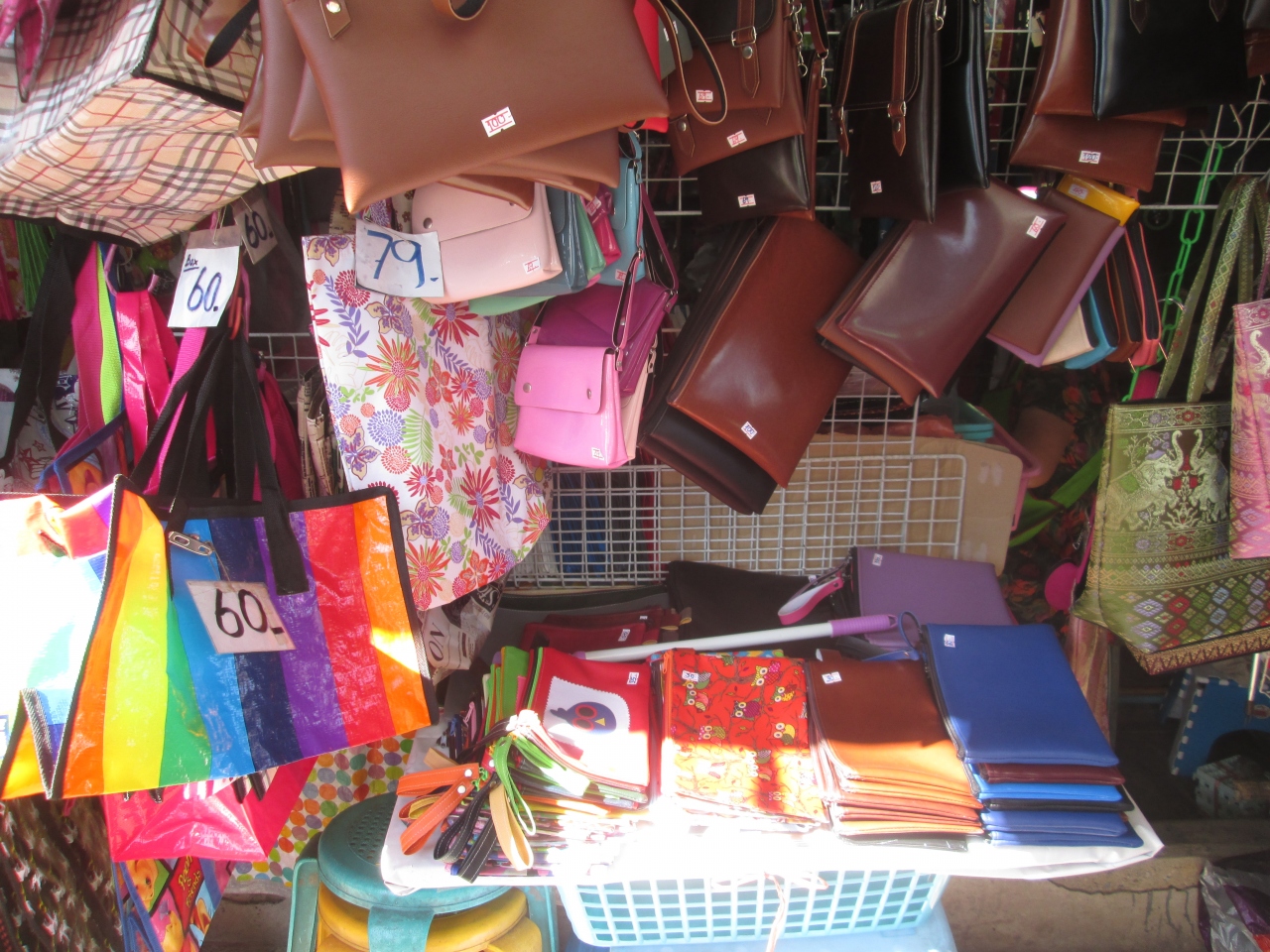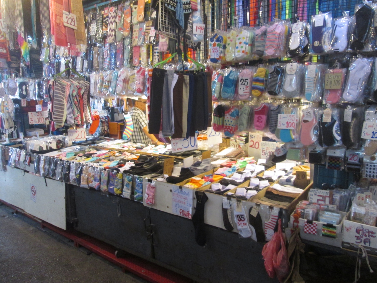 靴下、ハンカチ、小物入れ、財布などを扱うお店が並んでいる一角がありました。どれも数十バーツで、2つ、3つ買っても100バーツ以下という激安商品でした。日本の100円ショップよりも安く、かなりのお買い得感がありました。