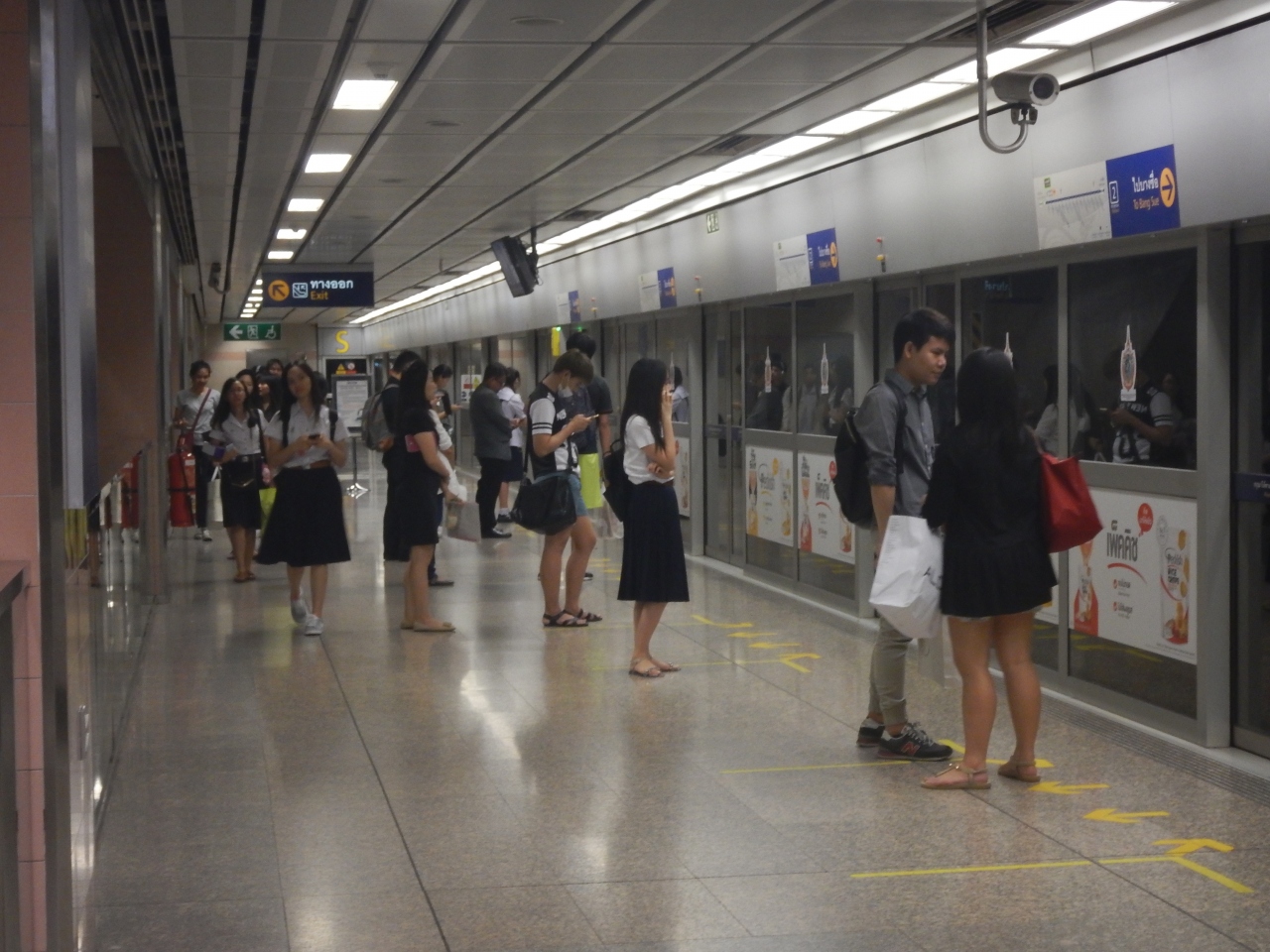 ワット・ホアラムオポーンを見学した後、スクンビット駅まで移動するために地下鉄に乗ることにした。地下鉄駅は新しいのでホームドアが設置されている。夕方学校帰りの大学生の姿が目に付いた。この駅の向かいの建物にプーパッポンカリーで有名なソンブーンが入っている。