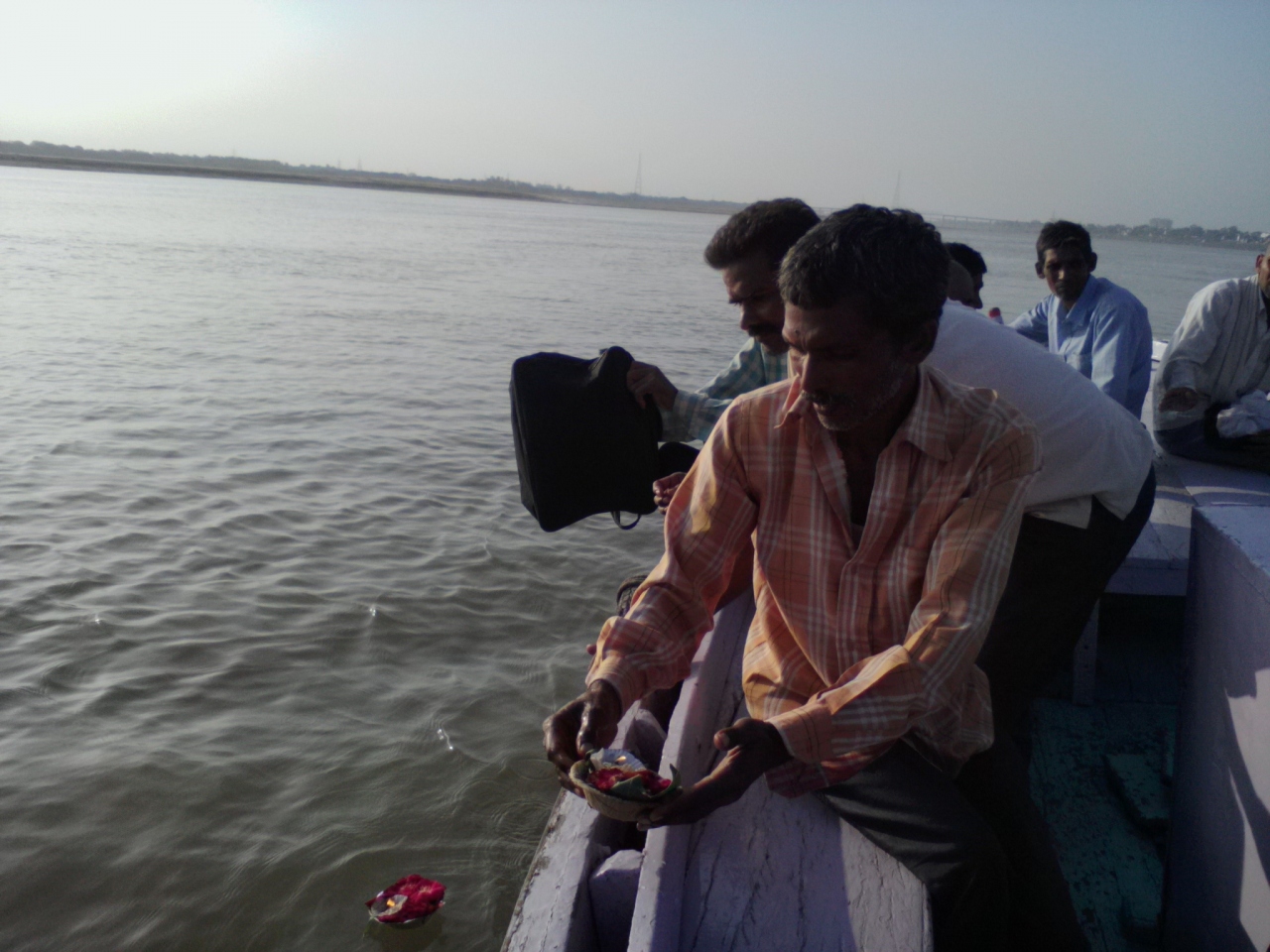 ガートを歩いていればどの時間でも間違いなく声が掛かります。向こうの言い値の相場は1時間1艘300Rs。4~5人は乗れるんじゃないかと思います。1人で300Rsはちょっとキツい、シェアしたいという方は朝の方がいいです。100Rsならすぐ見つかると思います。しかし50Rsでも乗れます。実際に乗りました。朝6:30頃ダシャーシュワメガートで探しました。そんなボートはないとかシェアなら100Rsとかいうヤツがいますがちゃんとあります。しかし若干違うのがこのボートは観光用ではなくインド人の巡礼用だということ。出発はある程度人数が集まるまで待たされます(私の時は20分ほど)。そして時間が30分ほどでコースがシンプルだということ。この時は火葬場のあるハリシュチャンドラガートまで行き、川の中央部で巡礼者達が花を流したり硬貨を投げ入れたりして、そのまま中央部を下り戻って来ました。私的にはこれで十分でしたが、さらに上流やダシャーシュワメガートより下流のマニカルニカーガートなども見たい方、もっとしっかり観光したい方は普通のボートにした方がいいと思います。