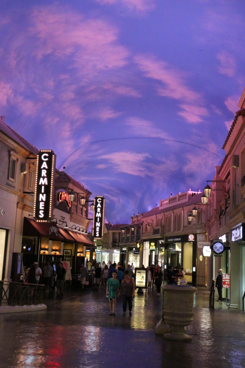 空が描かれたきれいな天井を持つショッピングモールです。本当にリアルに見えるので、今何時か、外の天気はどうだったか忘れてしまいます。中にはいろいろなお店が入っており、高いものを買わない人でも、Bath&BodyWorksやジェラートなど楽しめる場所はたくさんありました。
