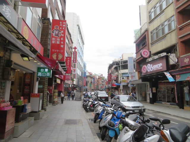 MRT淡水信義線の終点淡水駅からバス通りの中正路か商店街の公明街を歩くと5分位で行けます、道の両側にお店が並んでいます、買物・飲食が楽しめます、淡水名物の鉄蚤、魚丸の店も並んでいます、昼間行きましたが夜は露店が出ていて賑やかのようです、淡水河沿いの道と並行してますので帰りは河沿いを歩きました。