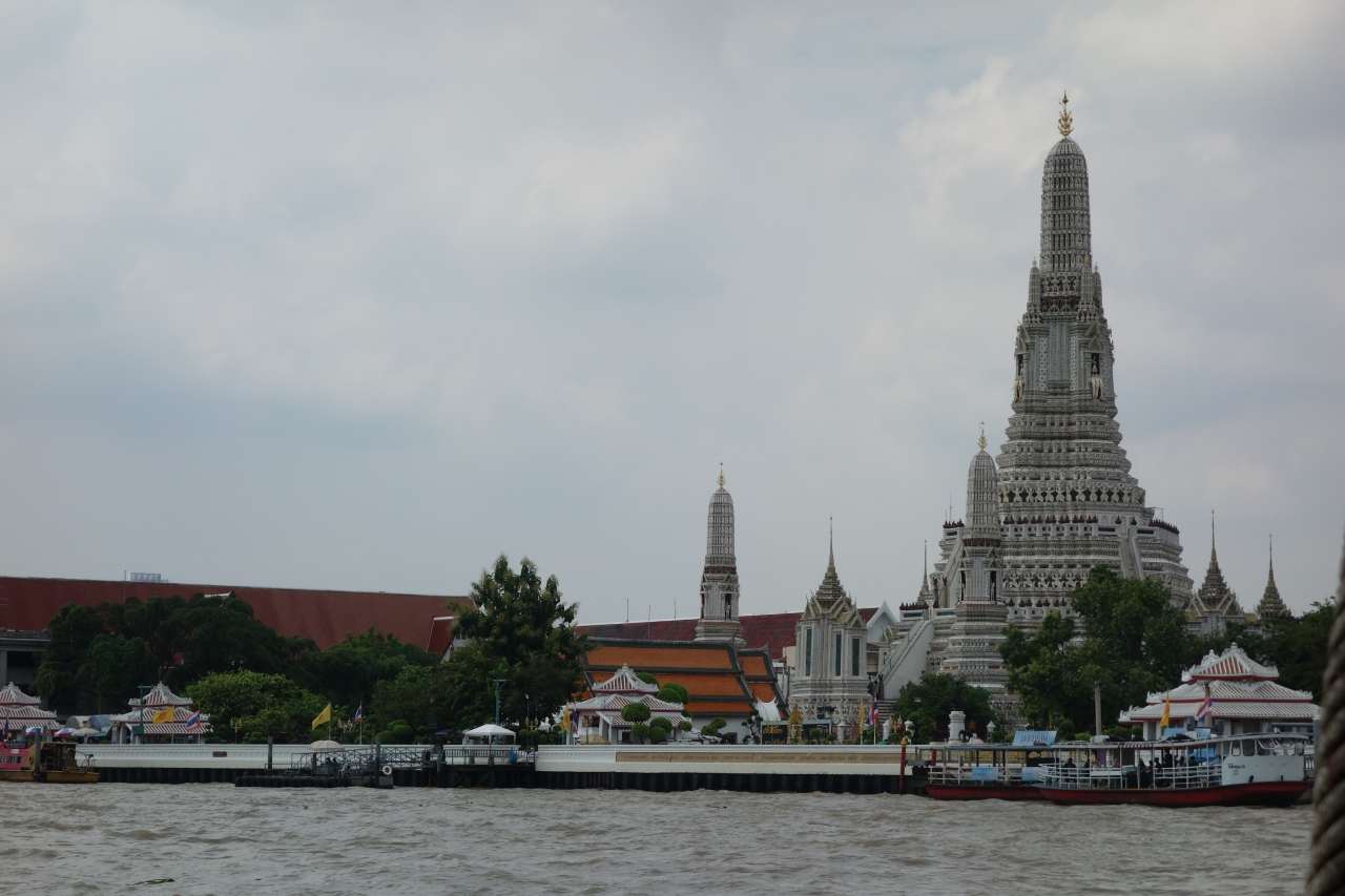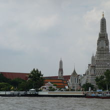 サトーン船着き場(サパータクシン駅から直ぐ)からチャオプラヤ川のエクスプレスボートを利用すると、渋滞知らずでワットアルンやワットポーへ行くことが出来ます。川は決して綺麗ではありませんが、川からの景色を眺めながらの道程ですので、ちょっとしたクリージング気分を味わえます。ワットアルンも工事が終わり、シートの囲いが取れた状態で美しい姿が川上から見られました。