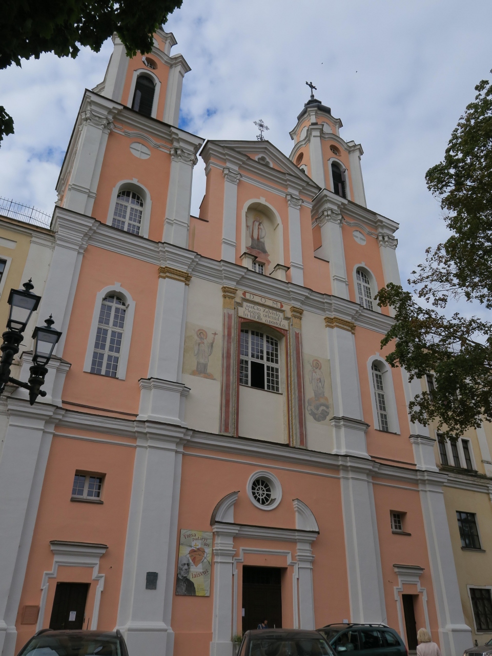 旧市庁舎の建つ、市庁舎広場に面して建つ、教会です。真っ白な姿で凛として建つ旧市庁舎に比べると、こちらは、淡いピンク色の優しい印象の建物です。二つの美しい形の尖塔と正面の壁に描かれた天使の絵が、18世紀に建てられた歴史ある教会ですが、親しみやすさを感じさせる建物です。