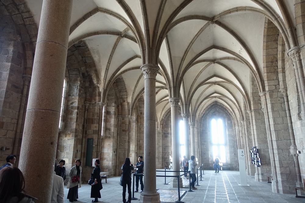 3階の食事室から2階の迎賓の間へと降りる階段の所には、モンサンミシェル創建の由来となっている、オベール司教が聖ミカエルから「岩山に聖堂を建てよ」とお告げを受けている彫刻があるのでお見逃しなく。聖ミカエルの親指が司教の額を押している場面です。