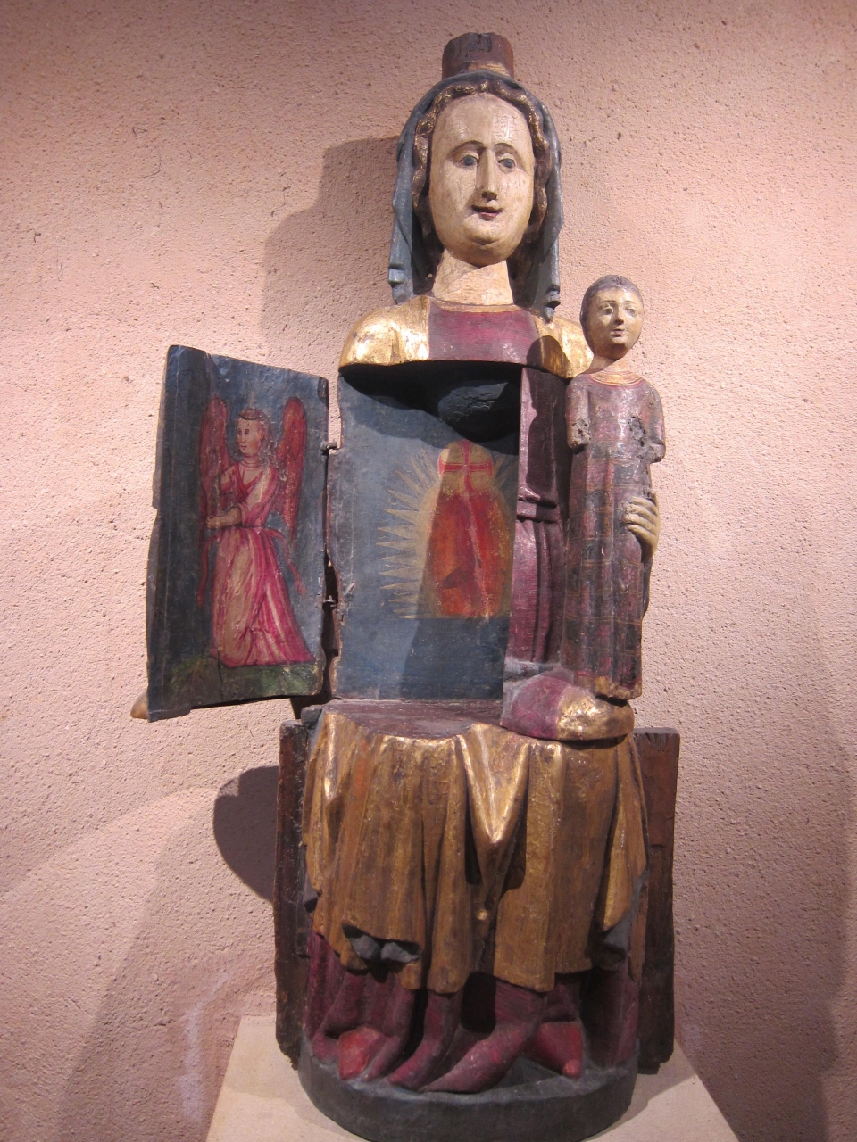 教会内部にある「開くマリア」像は、14世紀に作られた木造の、色つき、高さわずか120cmの像です。アルザスに唯一残る、めずらしい像です。との事。確かにあまり見たことが無いかも。綺麗とか、豪華とかとは無塩のマリア様。Eguisheimに来たら、見て欲しいですね。