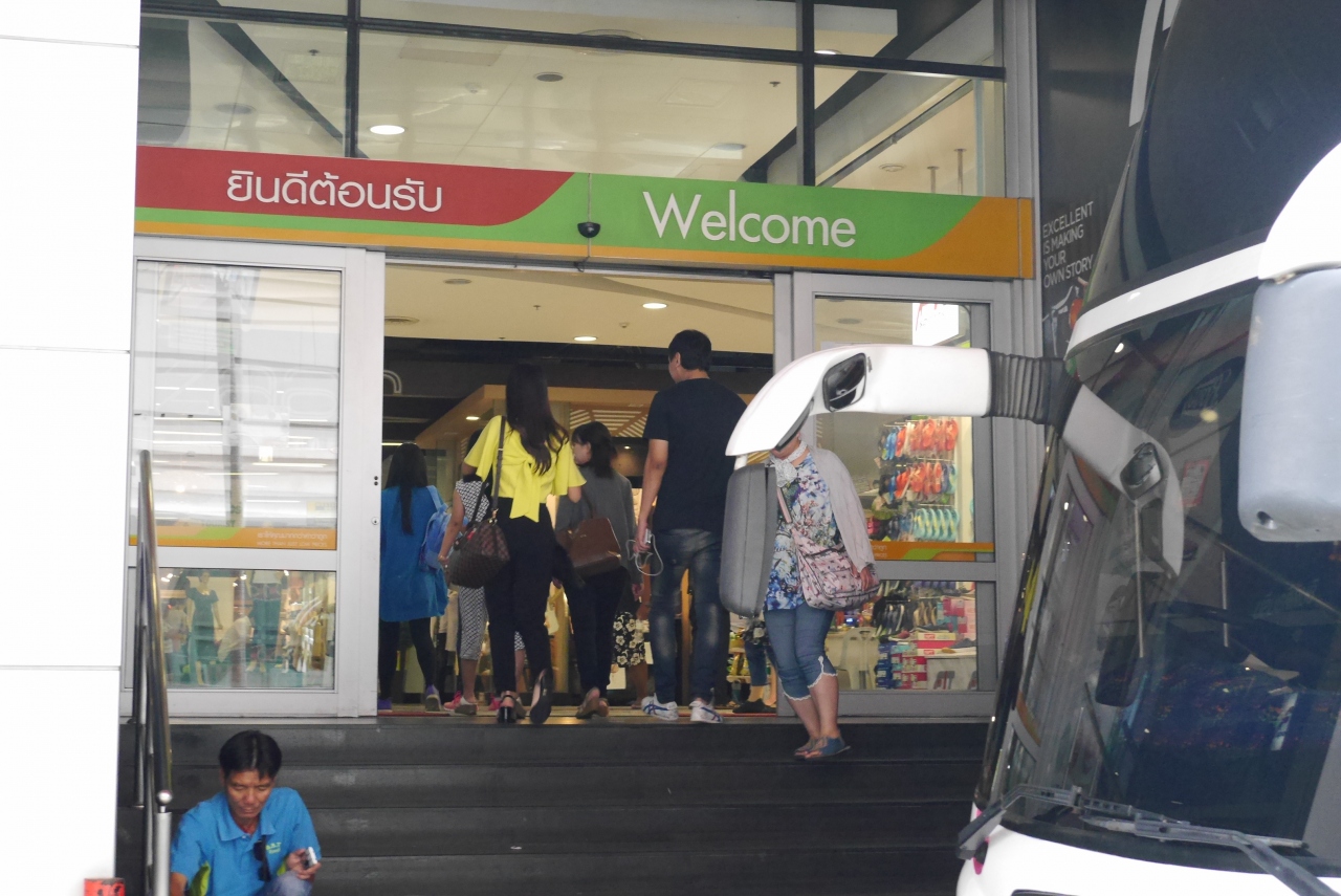 スクンビット地区からタクシーで行きましたが、建物横の入口から入りました。帰りはスーパー前では車が捕まらなかったので隣のホテルのロビー前から乗りましたが、白タク並みに300Bと言われ交渉しましたが折り合わず、一旦下車し、別の車に変わりました。別の車でも高い値段を言われ、結局160Bで折り合いを付けました。ちなみにホテルから来た時はスクンビット通りを真直ぐ来て50B位でしたが、帰りは一方通行の関係か、大回りしてそれなりの距離を走った気がします。