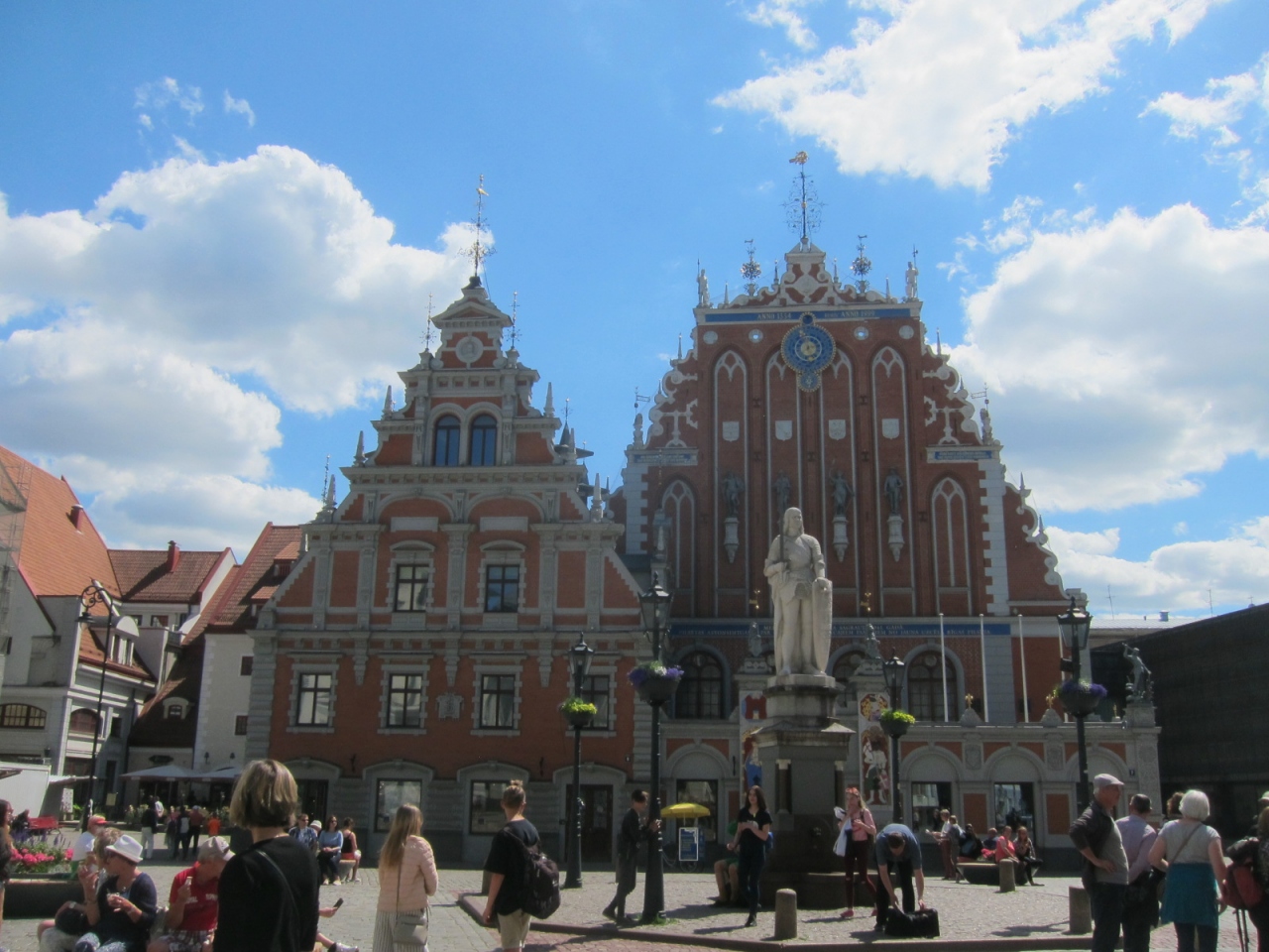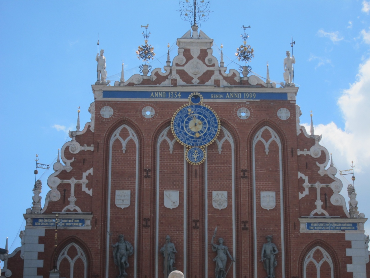 茶色の壁に白い縁取りと彫刻、右の建物には