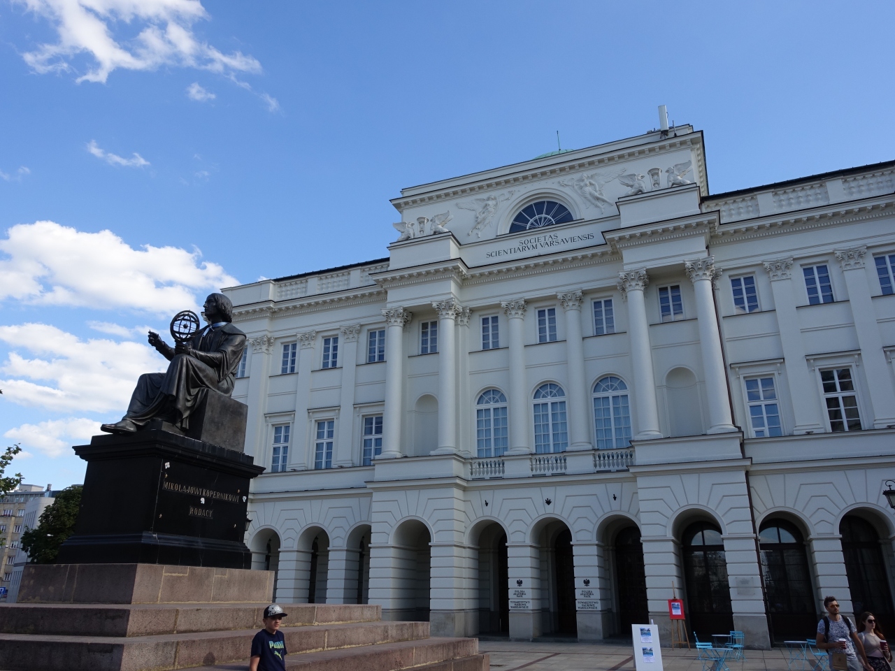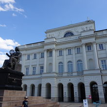 クラクフ郊外通りの南に端に、白い大きな建物が見えてきます。これがポーランド科学アカデミーです。その建物の前に、コペルニクスが腰かけた姿の像があります。左手に天球儀を持った姿です。ワルシャワでは、騎馬像や王の像など、勇ましいものが多いですが、静かに語りかけるように佇む、この像には惹かれるものがありました。