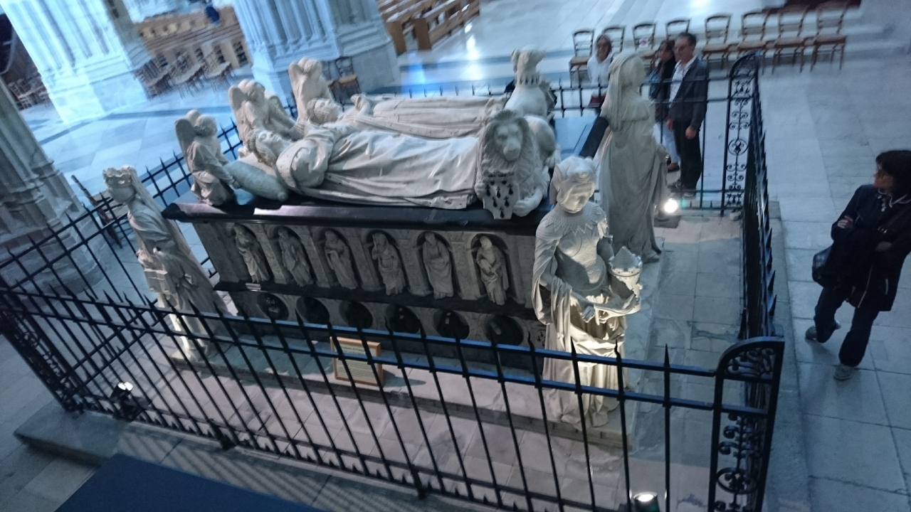 ナントにふさわしいと思われるような立派な教会です。キリストと聖人の物語や典型的なバラ窓のステンドグラスには正直飽きていたので流れるようなこの教会のステンドグラスの模様はかえって新鮮で魅力的でした。モザイクっぽくありますが、とにかく独特です。天気の良い日は光に透けて美しいです。ブリュターニュ大公墓の彫刻も立派で見ごたえがあります(上からも彫刻が見れるように階段が設けられています)