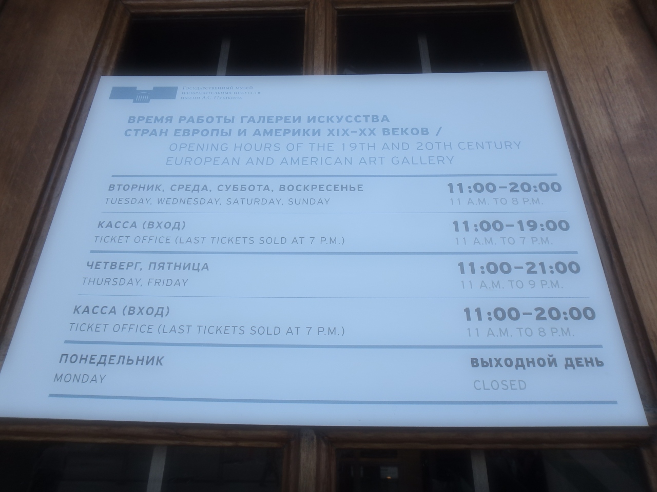 火曜日、水曜日、土曜日、日曜日は午後8時まで開館していて、木曜日と金曜日は午後9時まで開館しているので、クレムリンなど他の観光スポットが閉まった後からでも見に行きやすかったです。月曜日は閉館日です。ルノワール、ゴッホ、モネ、セザンヌ、ゴーギャンなどの作品がたくさんあり、絵画鑑賞が好きな方には必見のスポットです。フラッシュを使わなければ作品を写真撮影することができるので、フラッシュを使わずに撮影できるカメラを持参するといいでしょう。