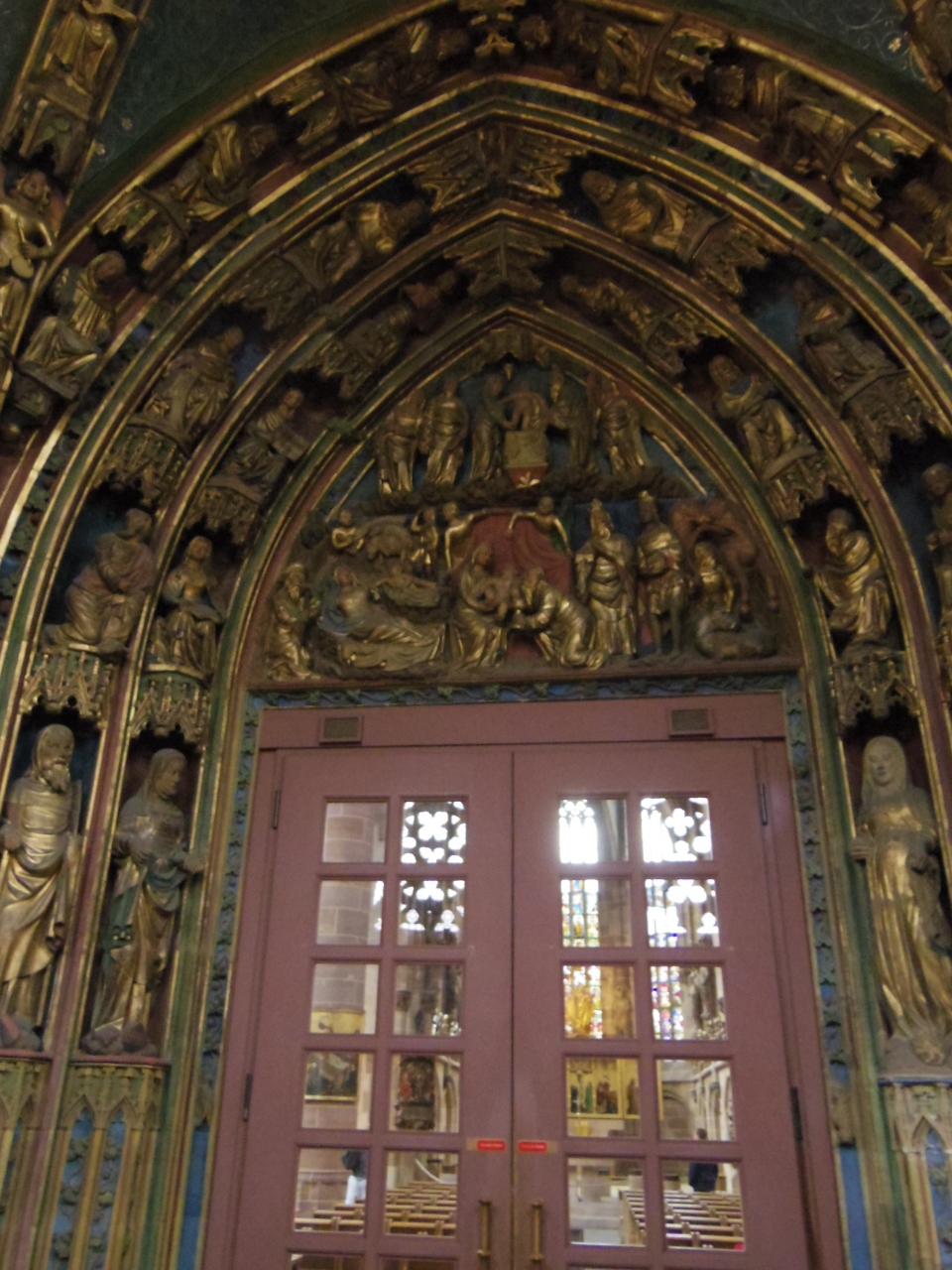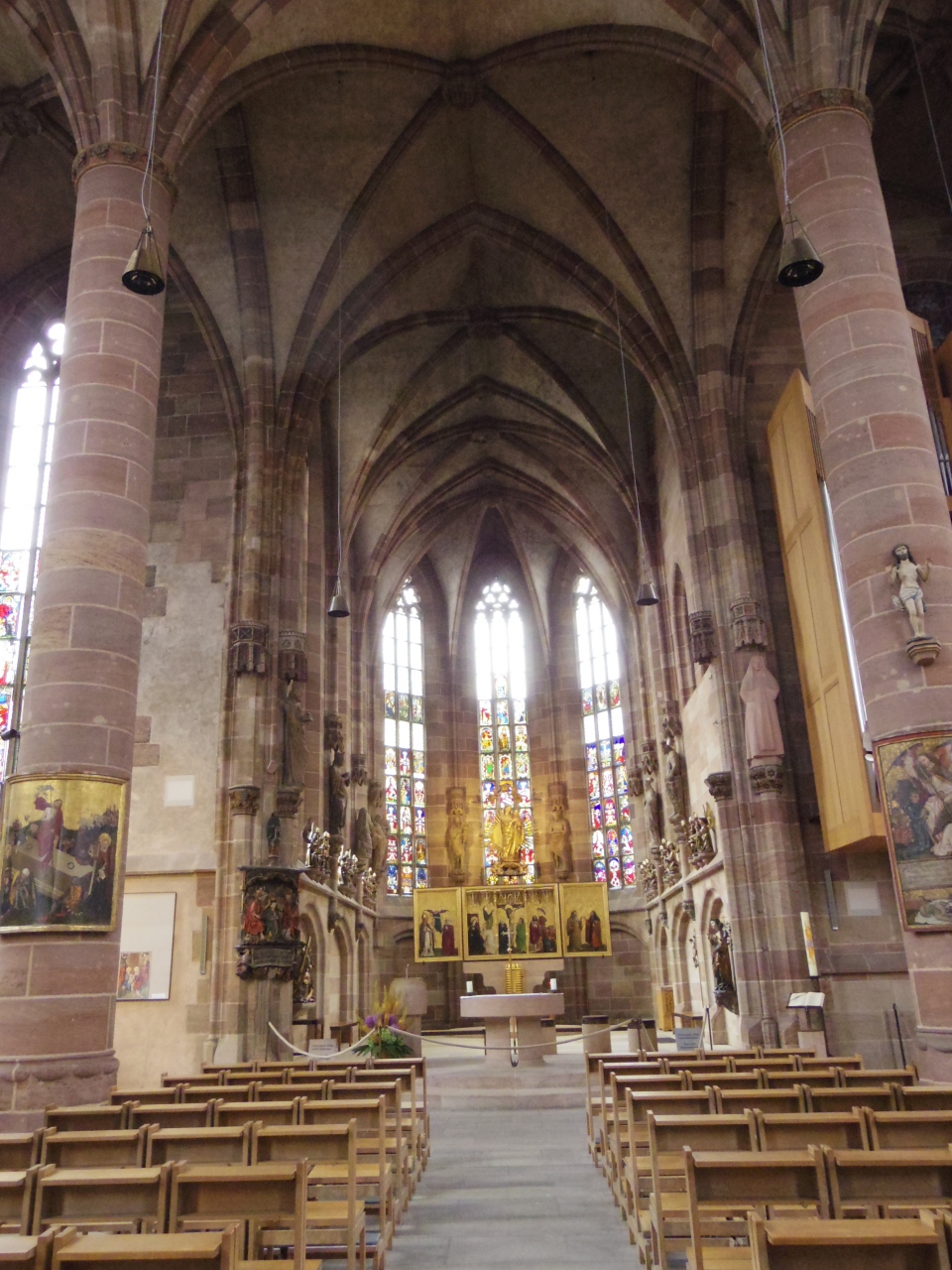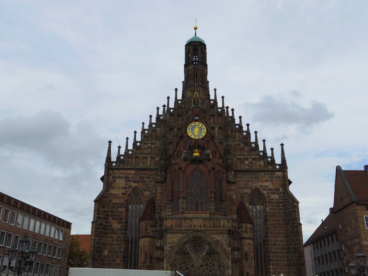 クリスマスマーケットが開かれる中央広場に面した所にある、ギザギザ屋根の端に小さな尖塔が付いている可愛い屋根の教会です。