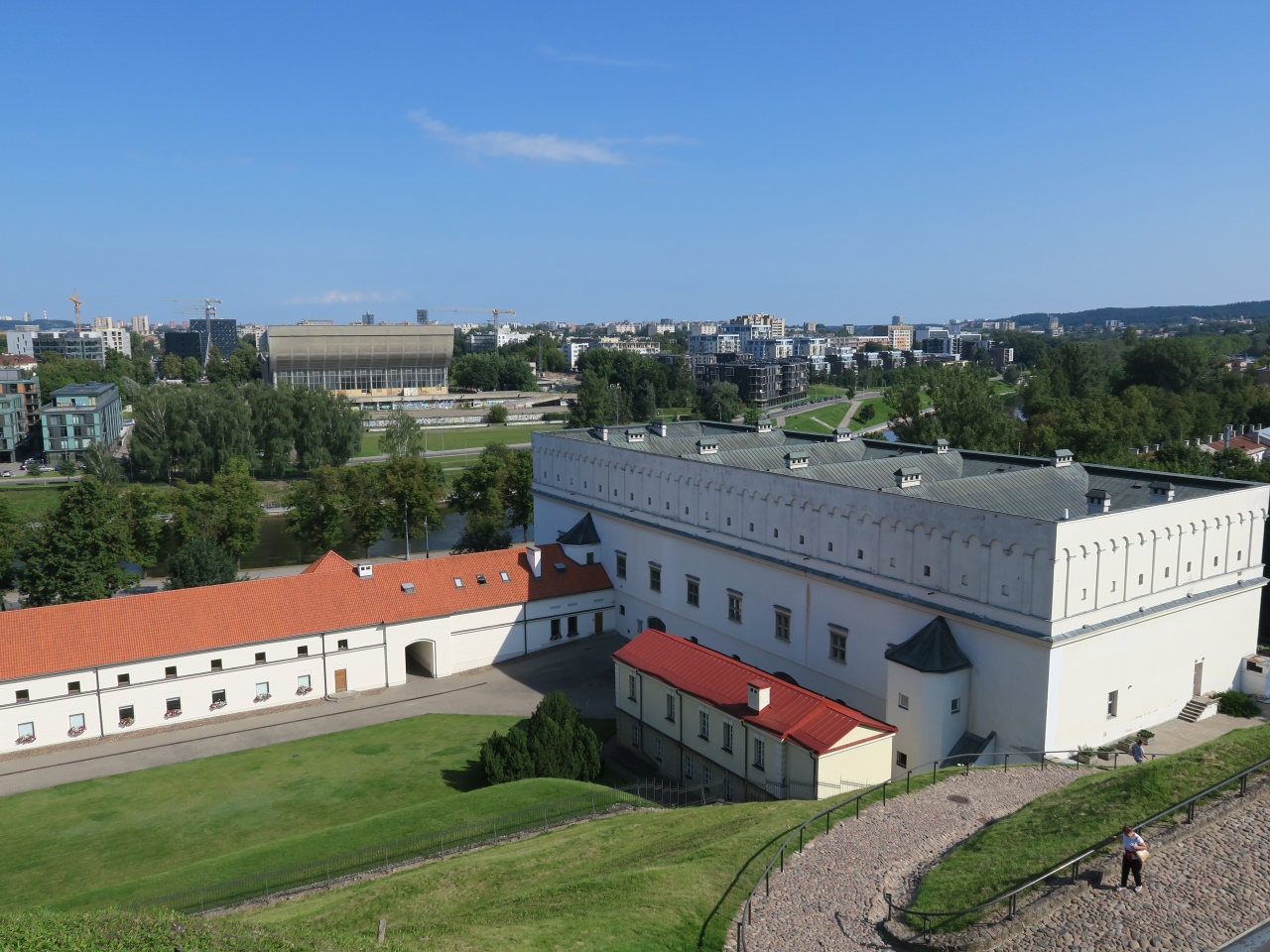 王宮の裏手にケディミナス城の遺構に建てられたケディミナス塔が見えますが、こちら側の登り口は閉鎖されていました。北側に周って、考古学博物館の庭からか、ヴィリニャ川に面したところに入り口があります。なだらかな丘を上がって行くと、城壁の一部が残された、丘の上に出ることができます。
