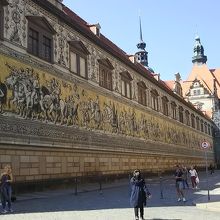 7泊したヒルトンホテルのすぐそばだったので観光、食事のたびに何回も通りました。歴代35人のザクセン王が描かれており下段に名前が書かれています。戦争で壊滅状態だったドレスデンの中で壊されることなく現存しています。約100メートルゆっくりじっくり観賞しました。すばらしいの一言ですがこの様な大作を雨ざらしででいいのだろうか心配です。