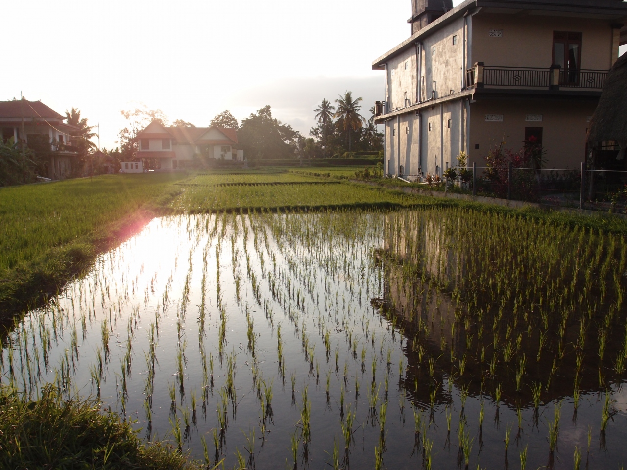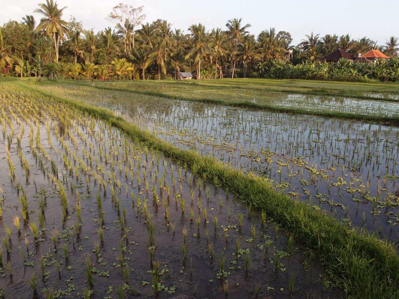 ウブド王宮のすぐ近く、Raya Ubud通りを右折してJl. Kajengに入ります。しばらく歩くと、田園風景が広がり、さらに細い道を沢づたいに山の中に入っていきます。小さな橋を渡って、沢の反対側を戻るように進むと、サリオーガニックやカフェ・ポメグランがある道にたどり着き、そのまま進むと市街に戻れます。多少わかりづらいので、Google mapで方向に間違いがないか確かめながら行けば、それほどハードルは高くないですね。(小さな橋を渡って、そのまま直進していた外人がいましたが、彼らは戻れたかな?)