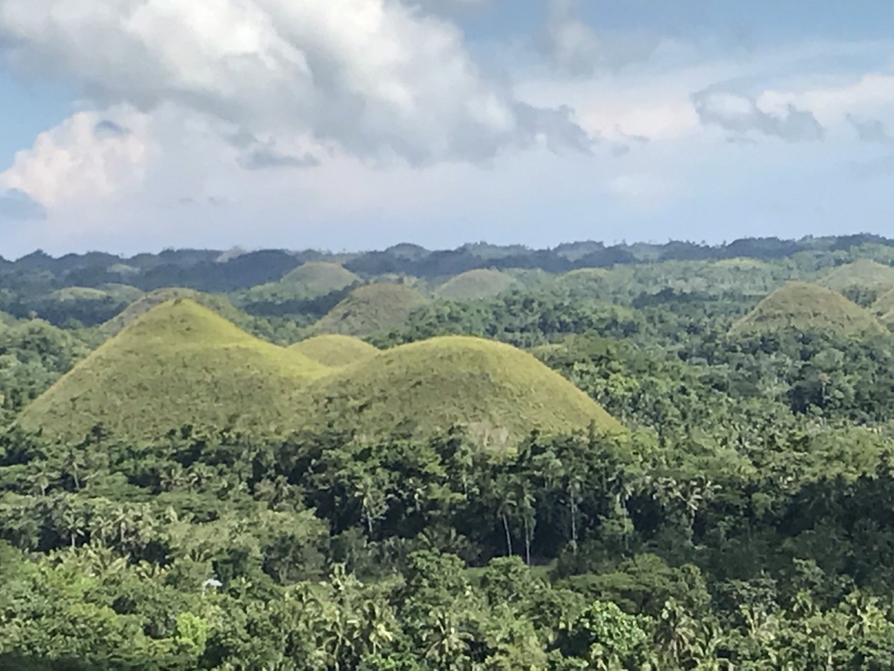千を超える円錐形の小高い丘があります。8月に行ったので残念ながら緑の丘でした。4月から6月は乾季で枯れて茶色になるそうです。ボコボコと盛り上がった30m程の丘は不思議な景色です。244段の階段は風が強く、手すりにつかまらないとふらつくほどです。階段の途中に休憩用の椅子があり休みながら登りました。
