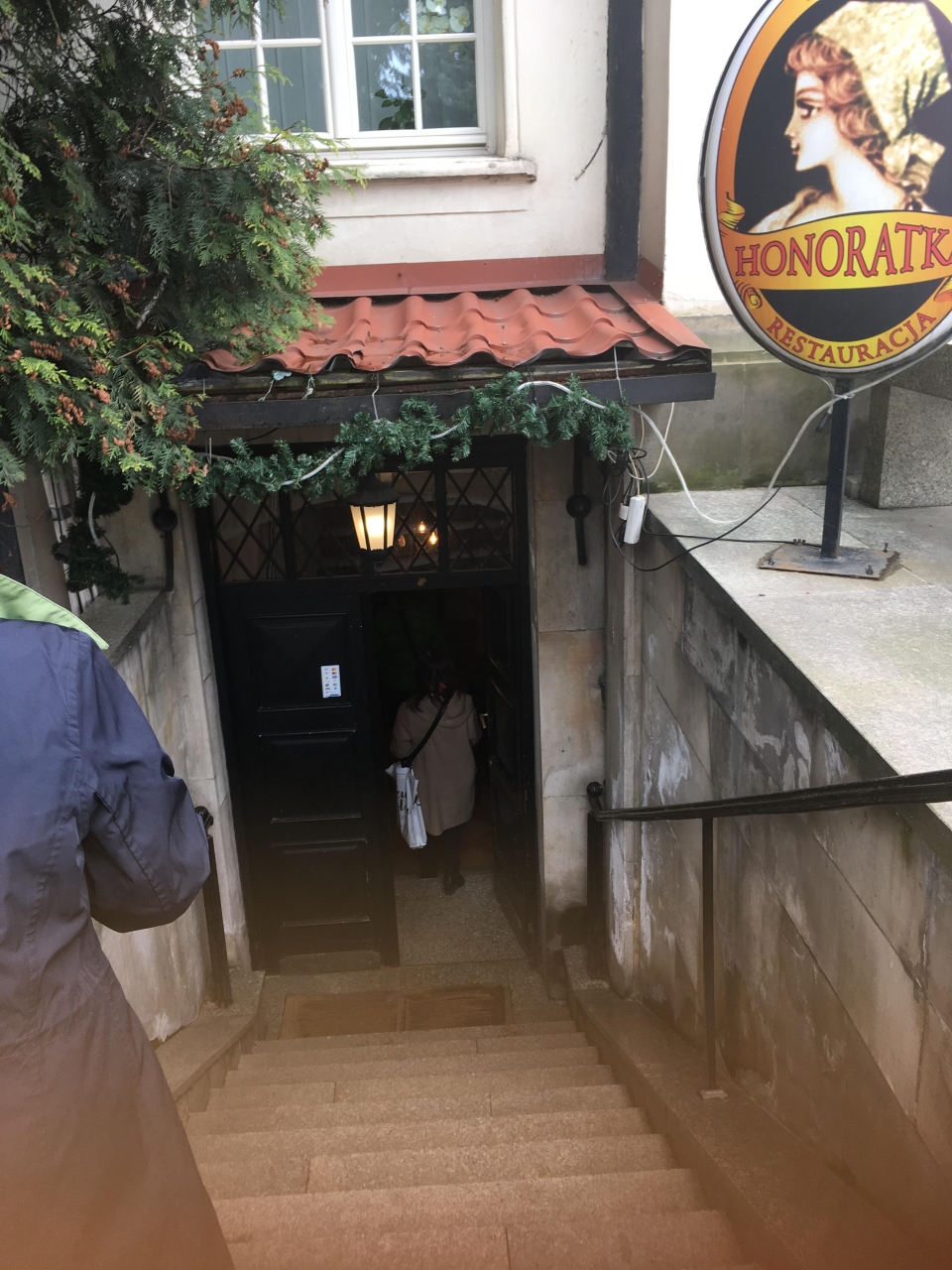 ワルシャワ旧市街地の西側、 バルバカンから 城壁つたいを歩いて10分ぐらいのところに ショパンが通ったといわれる 唯一残っているレストラン ホノラトカがあります。ワクワクしながら 階段を降りたところから中に入ると うす暗く雰囲気がありました。料理は ポーランド料理でした。(2017.5バルト54)
