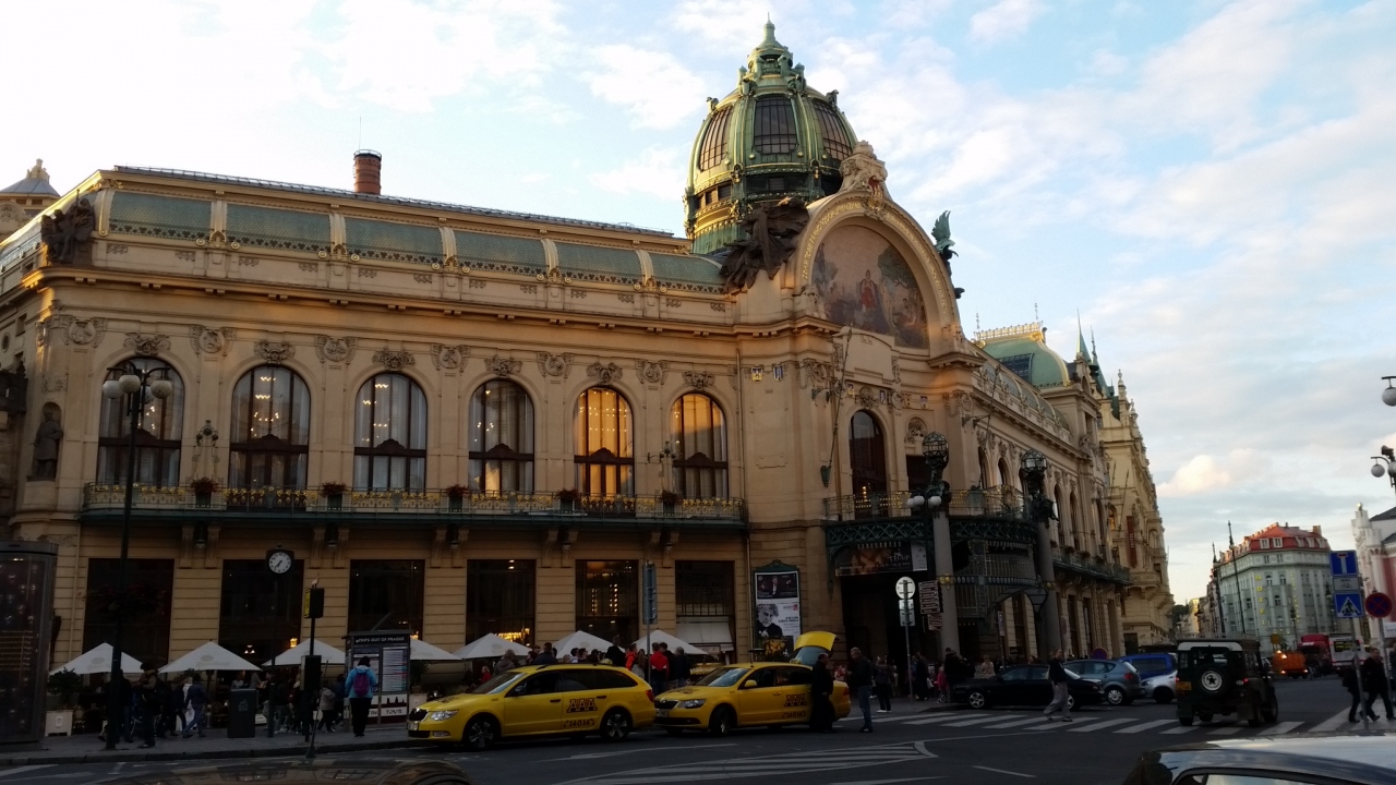 旧市街から地下鉄C線の、プラハ本駅へ向かう途中にありました。ツェレトウナー通りを火薬塔を右側に見て、通り過ぎると、左側にこの建物があります。豪華な装飾が施されていて、夕日を浴びて、一層輝いて見えました。時間があれば中も見たかったです。