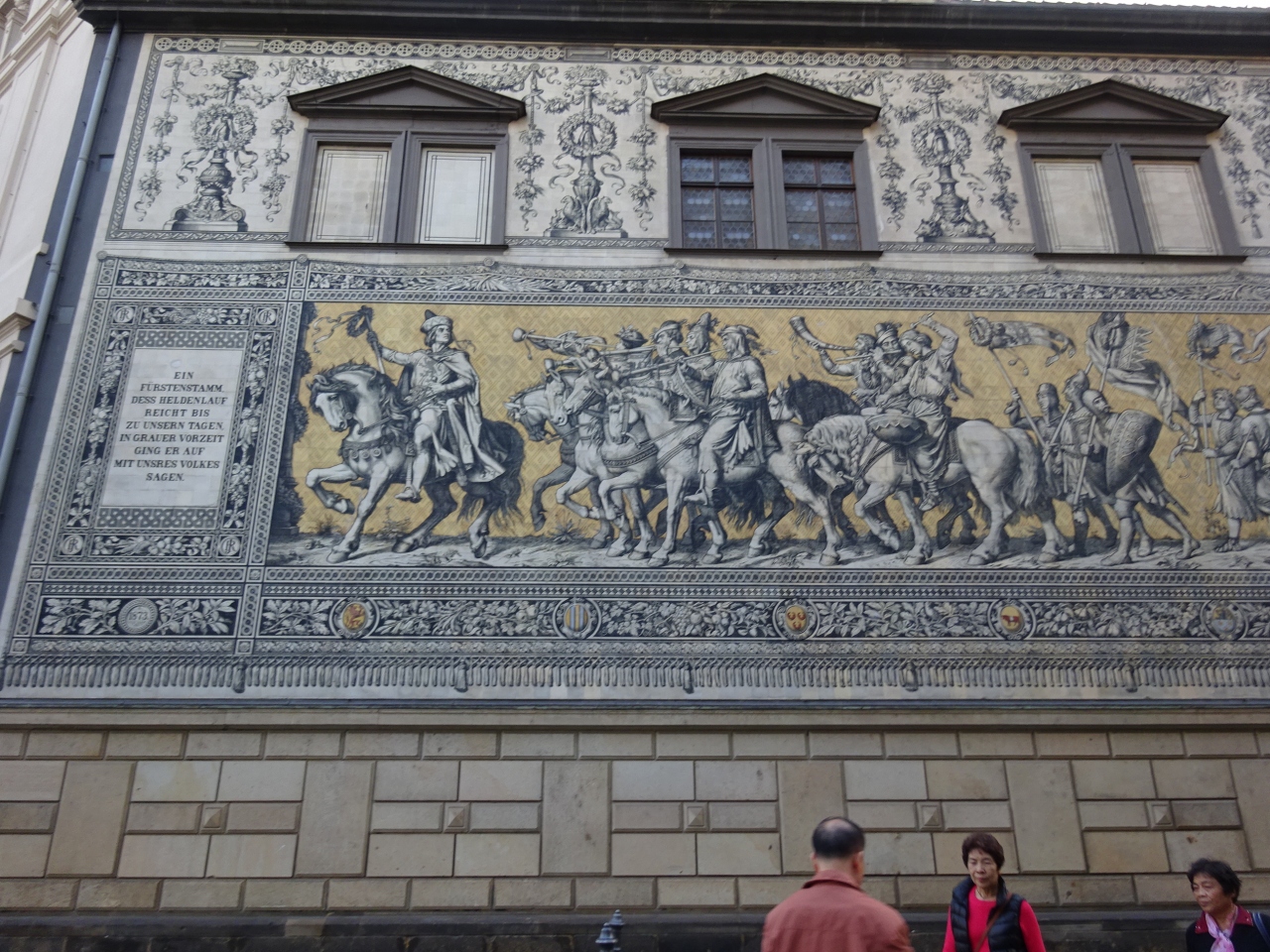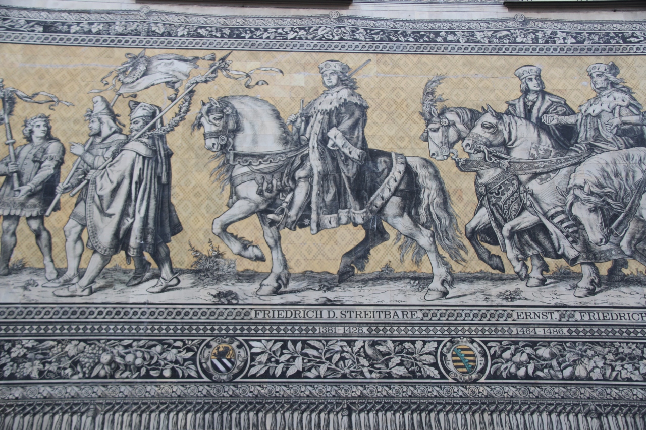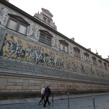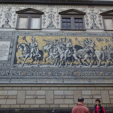 ドレスデン城の城壁にある、長さ約100mにものぼる、約2万5千枚ものマイセン磁器タイルを使って描かれた壁画「君主の行列」です。1907年に作られたこの壁画は、第二次世界大戦のドレスデン大空襲でも、奇跡的に残ったらしいです。