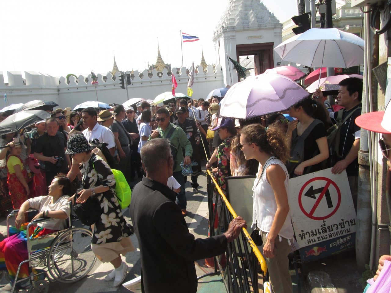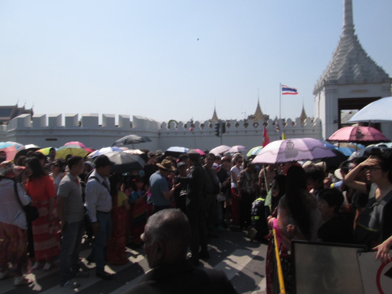 王宮内ではプミポン国王のご逝去に際して、国王の遺体が安置されているワットプラケオ敷地内のドゥーシットマハープラサート殿を一般弔問のために開放しています。タイ国の公式な式典が最優先され、次に優先されるのがこの一般弔問、観光目的の一般の訪問はその次の優先となるため、暑いなか待たされることがあり、体調を崩す人を見かけました。
