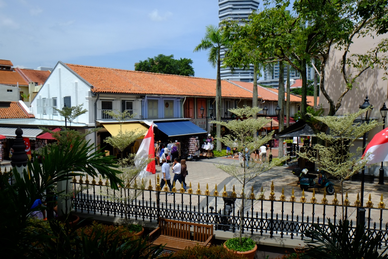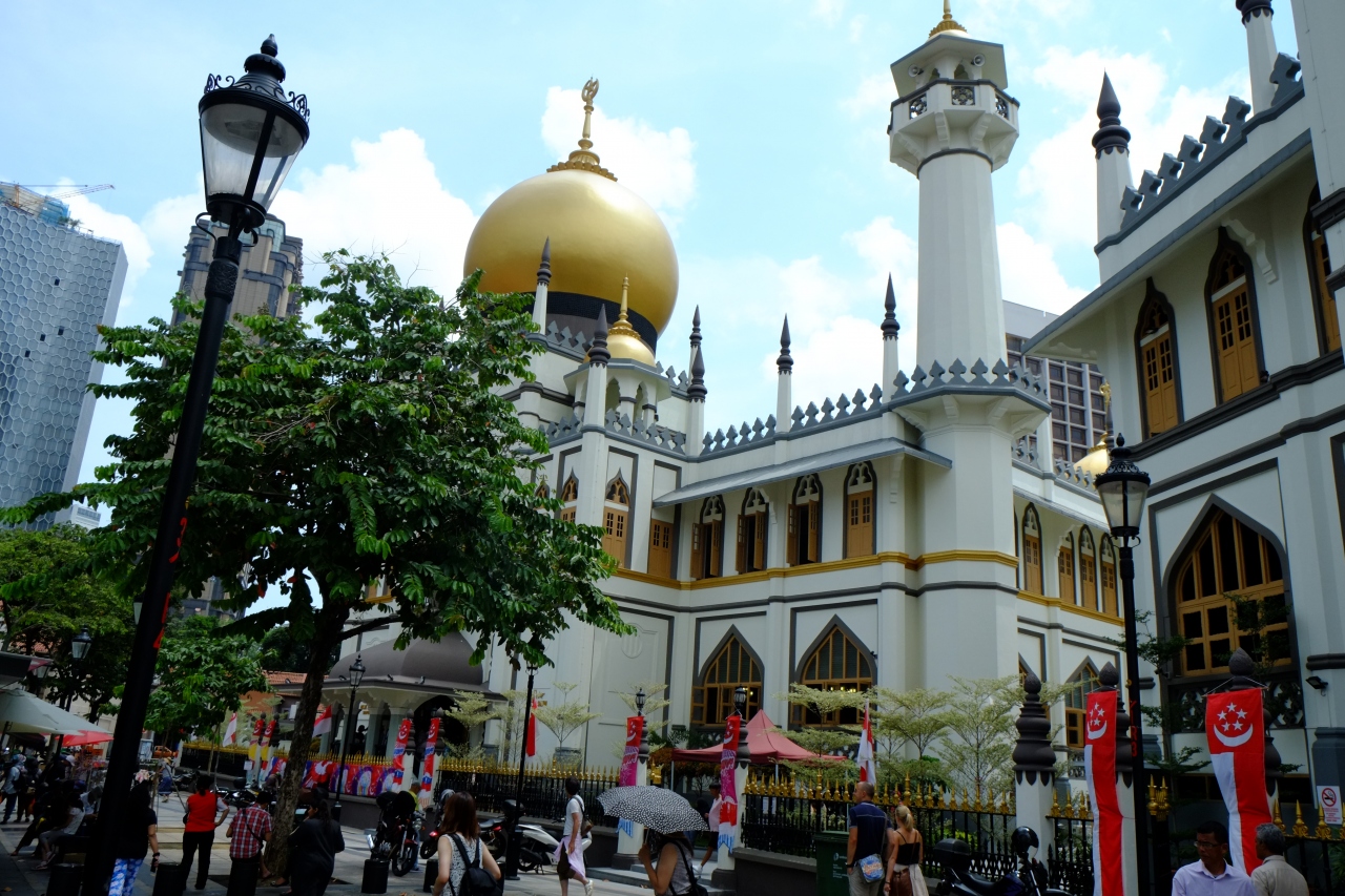 ここの中心はなんといってもサルタンモスク。金色のドームが目印で、礼拝時間以外だったら中(回廊まで)を見学することができます。通りのほうは建物自体はテラスハウス風で、店も観光客向けのもの。椰子の木がなんとなくアラブ風という雰囲気を出しています。