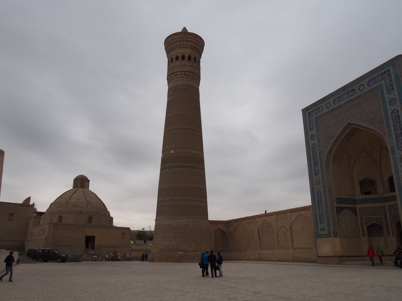 ブハラの旧市街で最も高い建造物(ミナレット)です。高さは46mで日干し煉瓦を積み上げたもので、円柱状の建物で上に行くにしたがって細くなっています。全体を見るには少し離れてみる必要がありますが、上から下まで一望に見ると、美しい円柱状であるのがよくわかります。12世紀に建てられたもので、お祈りを呼びかける意味合いもありますが、時代からは敵からの見張り台の役目を果たしていたそうです。