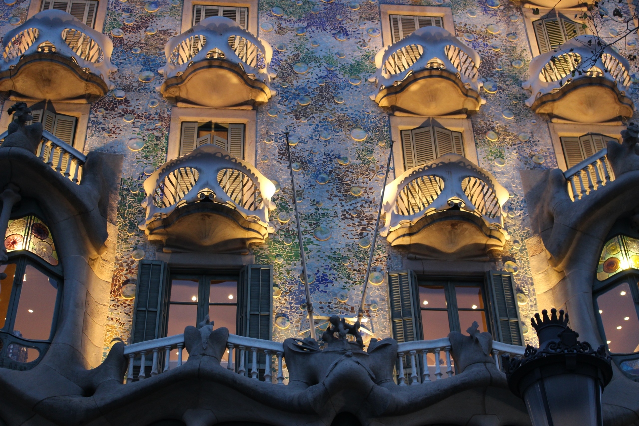 ライトアップされたカサバトリョは、骸骨のようなバルコニーが妖艶に浮かび上がり、窓に施されたステンドグラスも綺麗に見られました。