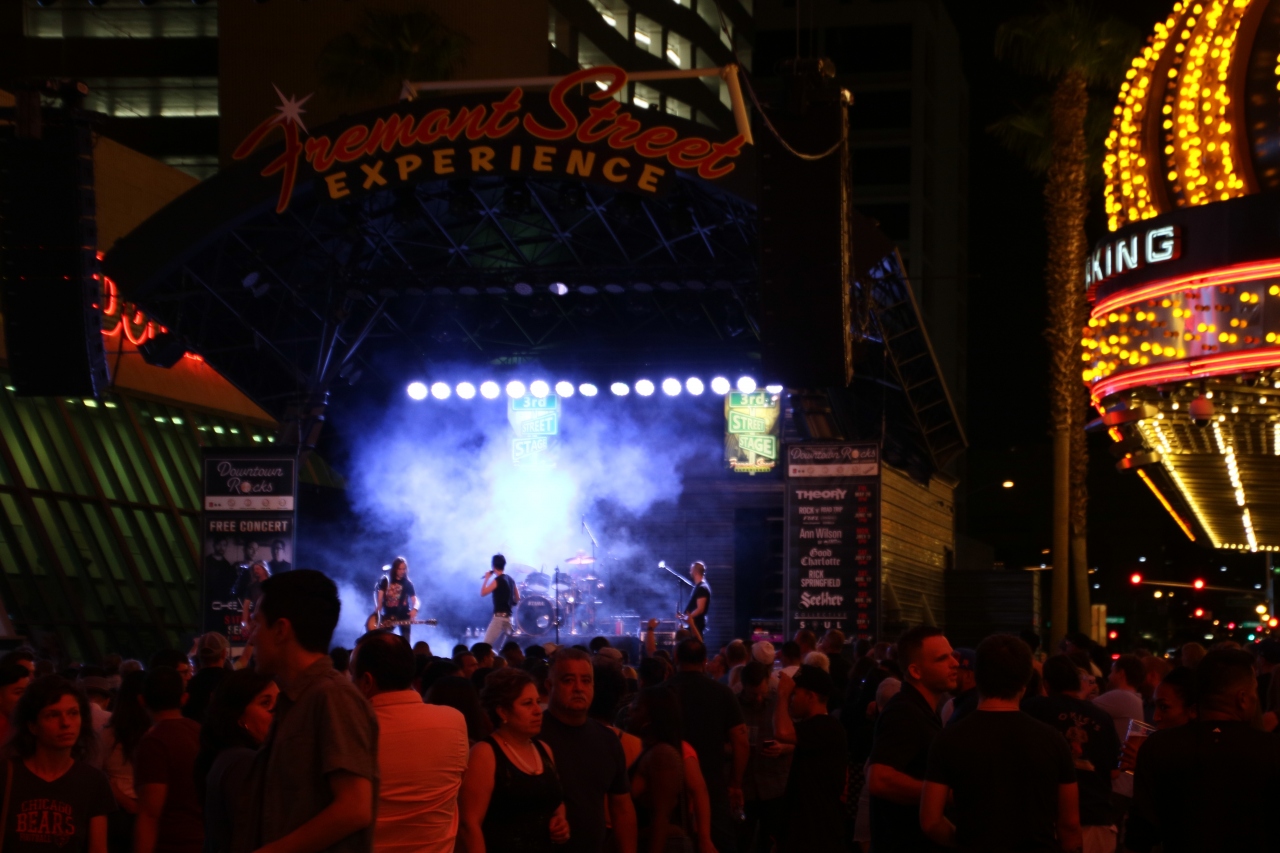 1時間に1回、フリーモントストリートの天井が有名アーティストの音楽とともにプロジェクションマッピングで彩られ、アーケードの下のジップラインを忍者のように通り過ぎる人影とともに楽しむイベントです。週末なのでとにかく人、人、人でごった返していました。ステージでは無料のライブも行われます。