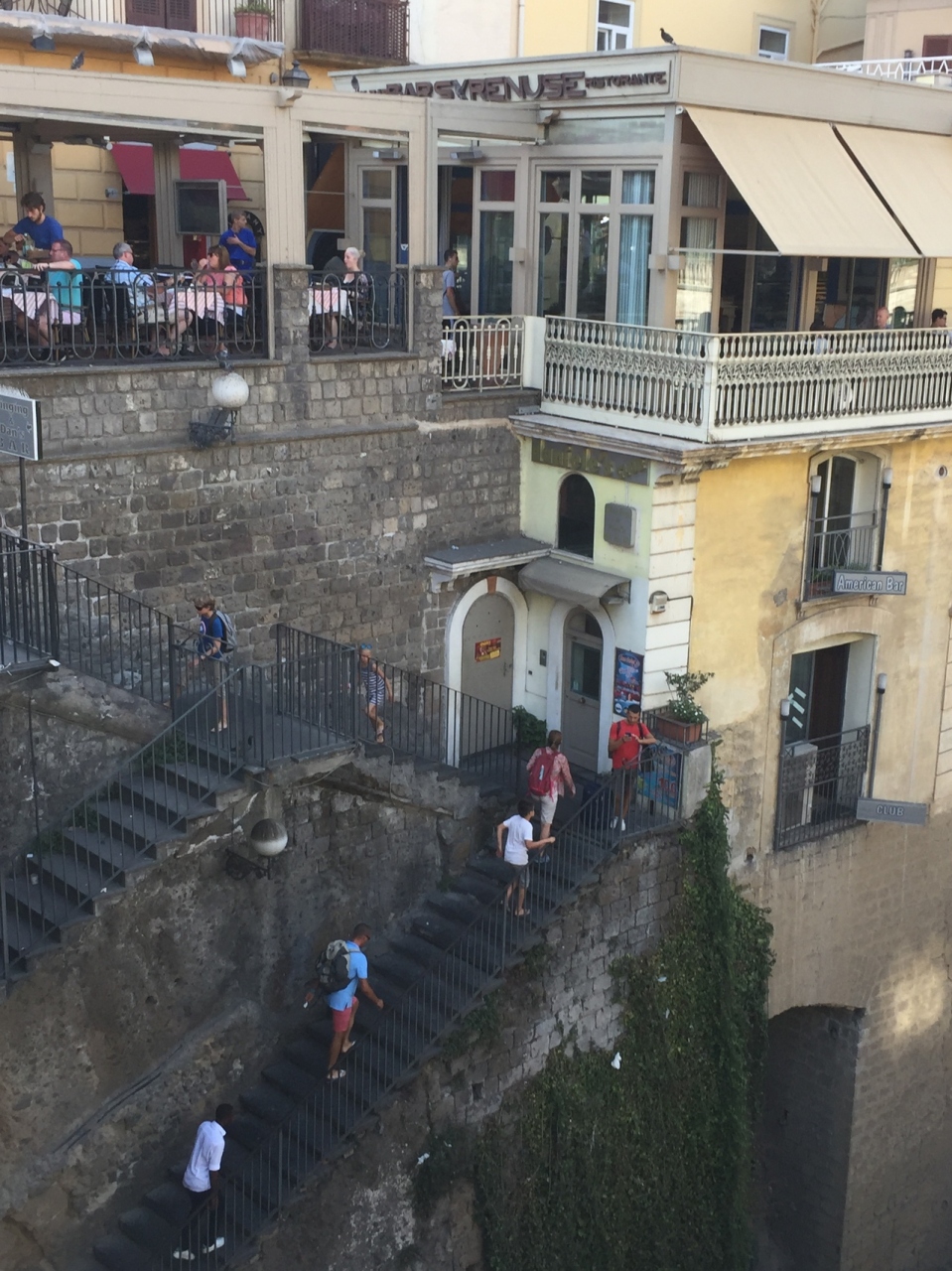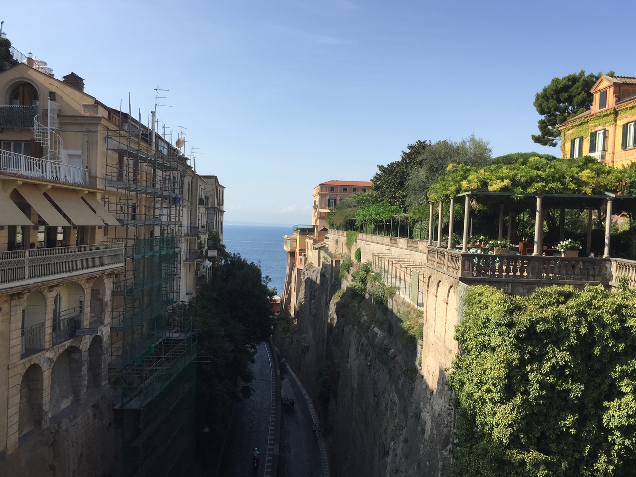 ソレントの中心的な場所です。ツアーで訪れたため、駐車場から歩いてきました。絶景ポイントは写真の場所で、深い谷越しに海が見えるため、皆がカメラを構えていました。地形的に崖の上にあるのが、ソレントだとよく分かりました。