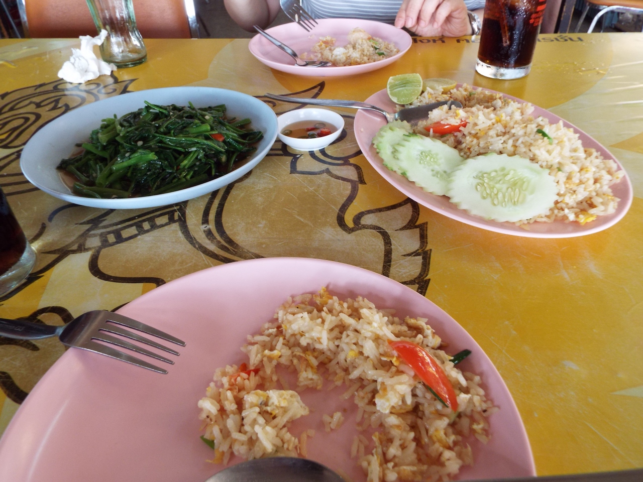 定番のエビチャーハン(M/200B)と空芯菜(100B)を頼んだのですが、空芯菜がなかなか来ないで・・遅めに運ばれてきたら、ピリ辛でした。