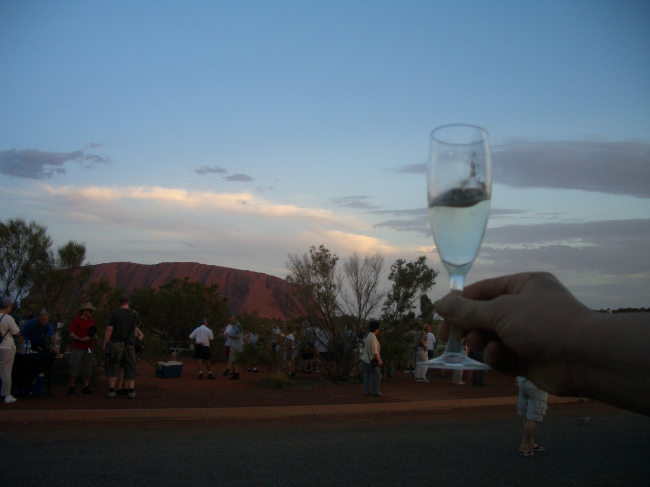 残念ながら風のため、エアーズロックには登ることが出来ませんでしたが、その日の夕方にサンセットの綺麗な景色を楽しみました。日が沈むまでしばらく時間がかかりましたが、その間にシャンパンが配られて、それを飲みながら景色をぼーっと眺めていました。