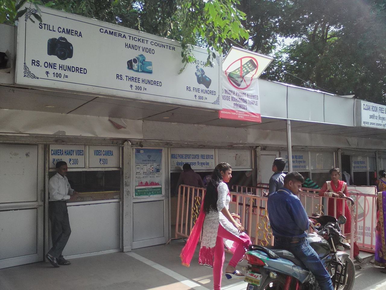 入場料は必要ありませんが入口でスマホなどのモバイル機器は預けなければなりません(無料)。デジカメやスチールカメラは持ち込み可です(100Rs)、ビデオカメラ(300Rs〜)。スマホの預け場所の横に靴の預け場所(無料)もありますが、ここで預けてしまうと寺院に入るまでの150mほどを裸足で歩かなければなりません。皆、直前の入口で靴を脱いでいるのでそうした方がいいです。