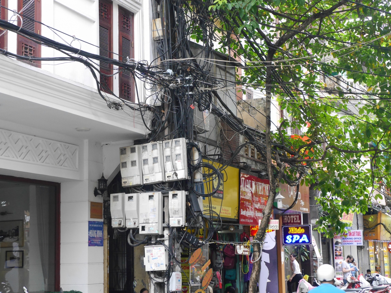 狭い道をバイクが走り回り、通りごとに同じ業種の店が並んでいます。食堂街、シルクを扱う衣料品街、鍛冶屋街、機械部品街等、角を回るごとに新しい街並みに変わります。電柱には蜘蛛の巣のように電線が絡み合い、路上駐車のバイクを縫って歩かないといけません。