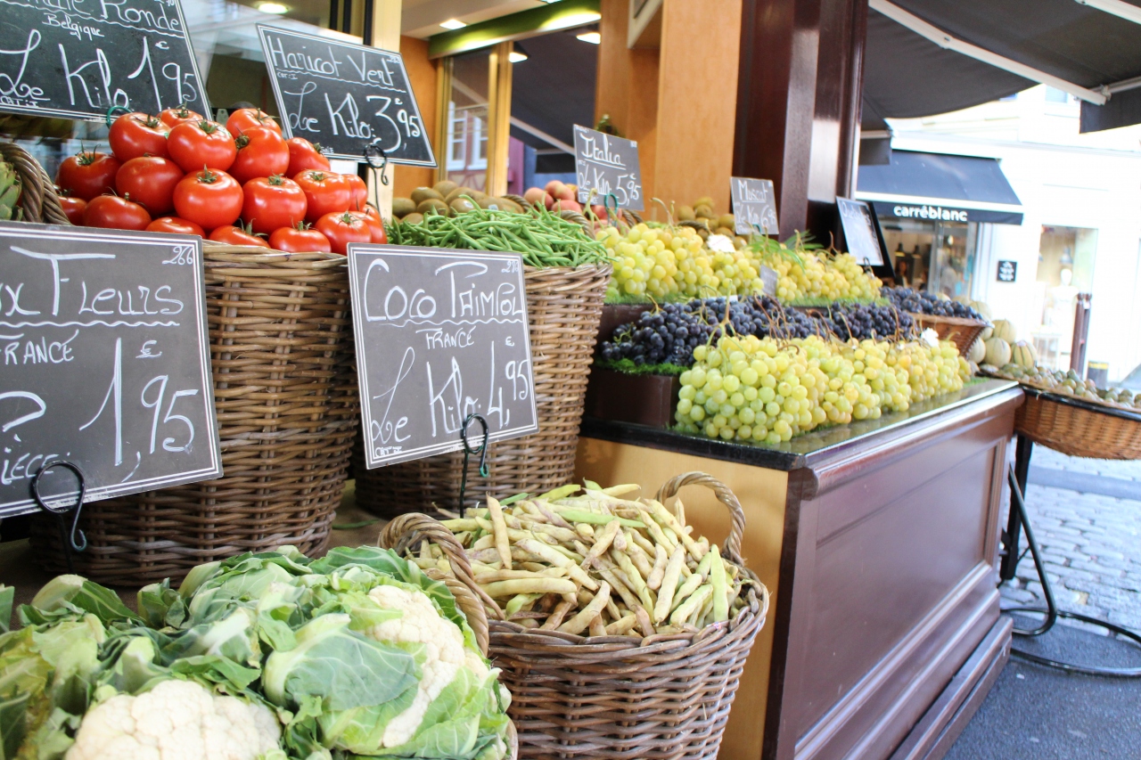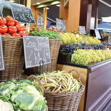 市場には新鮮な果物・花・魚屋さんなど ちょっとしたお買い物によい