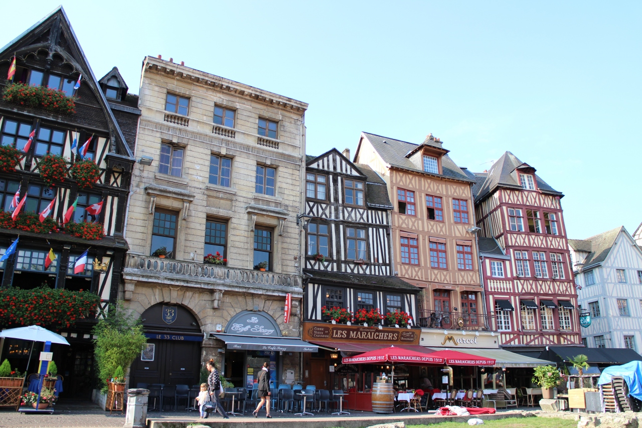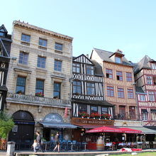 広場の周りにはノルマンディの趣のある木の建物