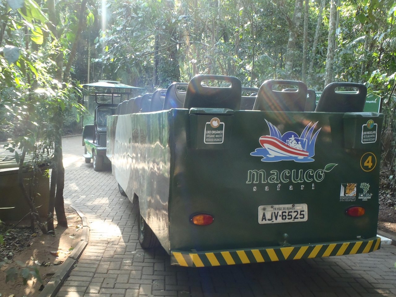 マクコサファリでは、まずゲートから専用のカート(20人乗り位)でジャングルの中を移動しながら、カートに同乗する運営会社のガイドから説明を聞きます。ジャングルに生えている植物や樹木、動物などの説明(ポルトガル語または英語)があり、これに要する時間が結構長い…。