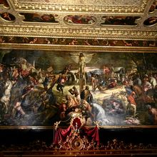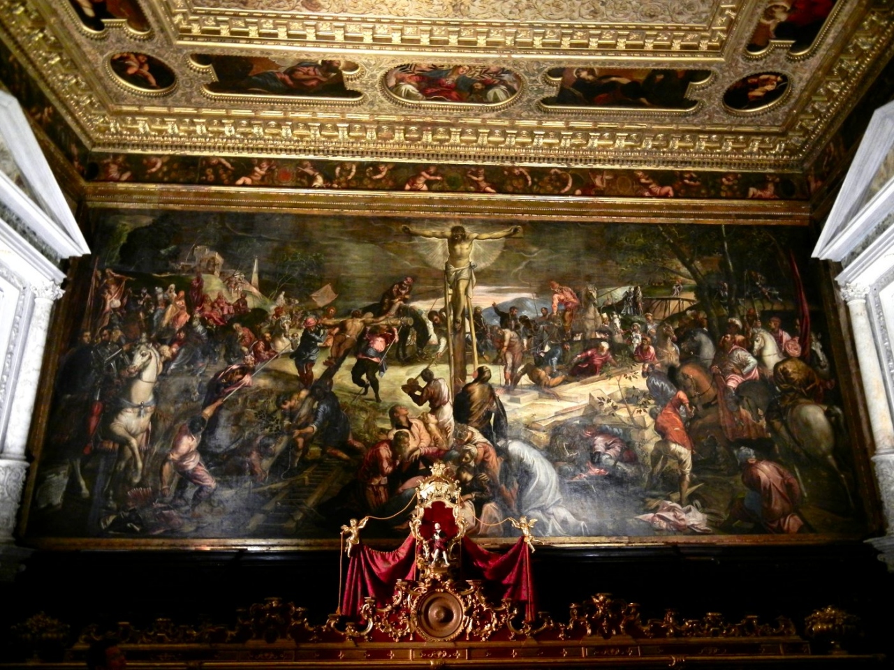 ティントレットは、主要な作品数点を無報酬で描き上げることで、残りの五十数点の仕事を一手に引き受けたやり手営業マン(←注:褒めています)で、20年以上も掛けて完成させました。僕はまったく見習う気にはならないが。