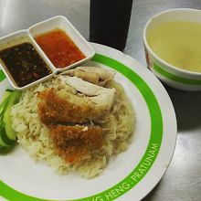 揚げと茹での2種類がのった50バーツのカオマンガイを食べました。