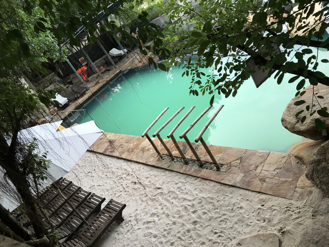 個室には、他に、トイレ、専用温水シャワー、(たいしたことない)アメニティ、ドライヤー、テレビ、エアコン、ファン、があって、食事もマッサージも部屋内で済むので、泥風呂に20分入ってから、そのあとのミネラルハーブ風呂に入れ替える間の40分くらいをオープンスペースのプールや温泉にて過ごす間以外は、他の人と会わずにゆっくりできます。